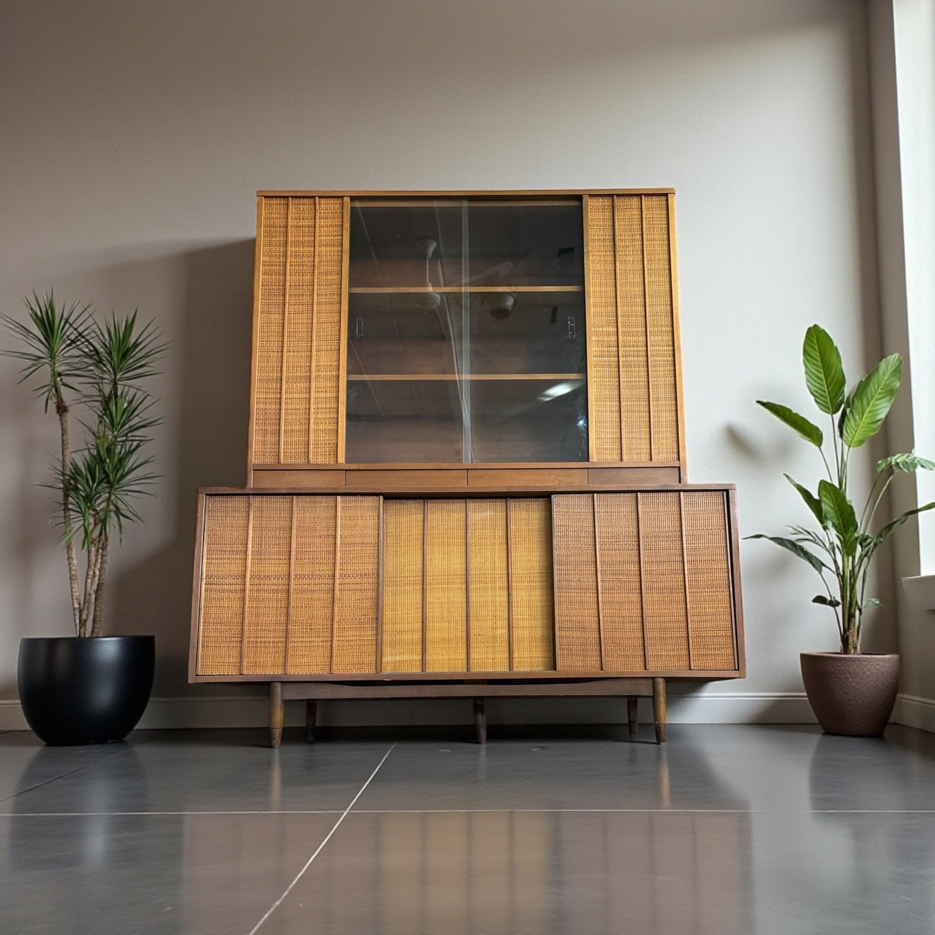 Mainline by Hooker Mid-Century Modern China Cabinet / Hutch Credenza ✨ This stunning Mainline by Hooker china cabinet is a true mid-century modern classic. With its clean lines, warm wood tones, and iconic woven-front paneling, it brings both function and timeless style to any space. Use the full piece together as a striking dining room hutch or living-room display unit, or separate the top and bottom to enjoy a sleek credenza that works beautifully in an entryway, office, or media room. Versatile and elegant, this piece blends effortlessly with modern, Scandinavian, boho, or classic décor. Features: • Beautiful woven-front sliding doors on both upper and lower sections • Upper display cabinet with glass doors and non-adjustable shelving • Lower storage credenza with generous interior space • Four dovetailed small drawers on the top part and 3 dovetailed drawers in the bottom part (smooth, solid construction) • Solid wood legs and high-quality craftsmanship • Iconic Mainline by Hooker mid-century styling • Excellent for storage, display, or as a statement piece in any room A rare find in this condition—this cabinet is both functional and artful, ready to elevate your home. 66”w 20”d 76”h Top part is 58”w 14”d Bottom part is 31”h, top part is 44h Pick up in Crest Hill, no holds. Delivery is available for a fee