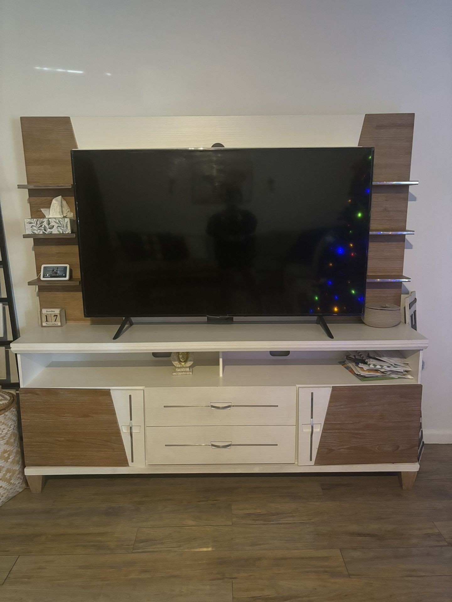 Rooms to go tv stand little tear and wear very heavy 2 piece tv stand can be used without back 2 drawers 2 cabinets 7 shelves 3 on each side and one behind tv OBO
