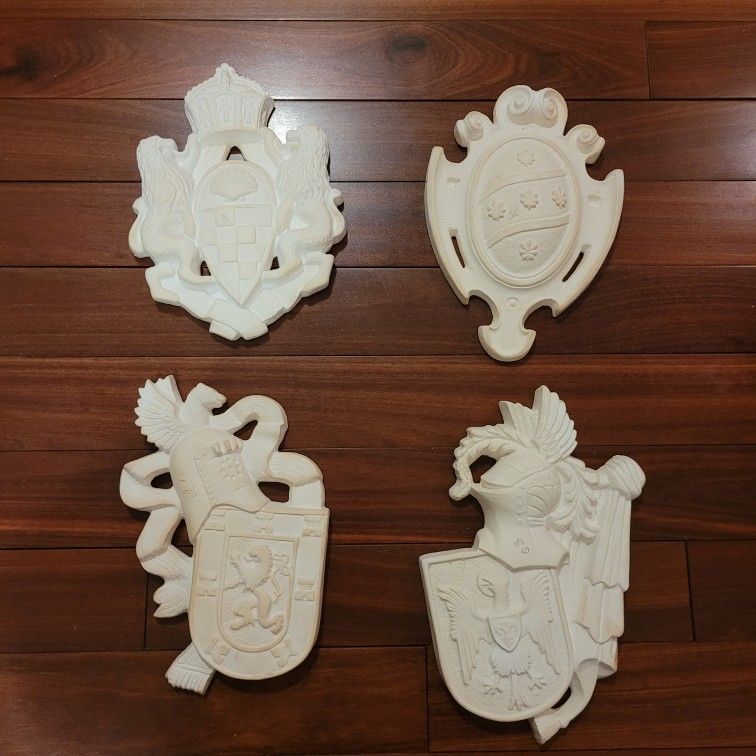 4 handmade plaster family crests with loop hangers on back. Sizes vary but each is approximately 10"x 8" Crest in top right corner has been repaired, bottom piece glued on. Price is for each
