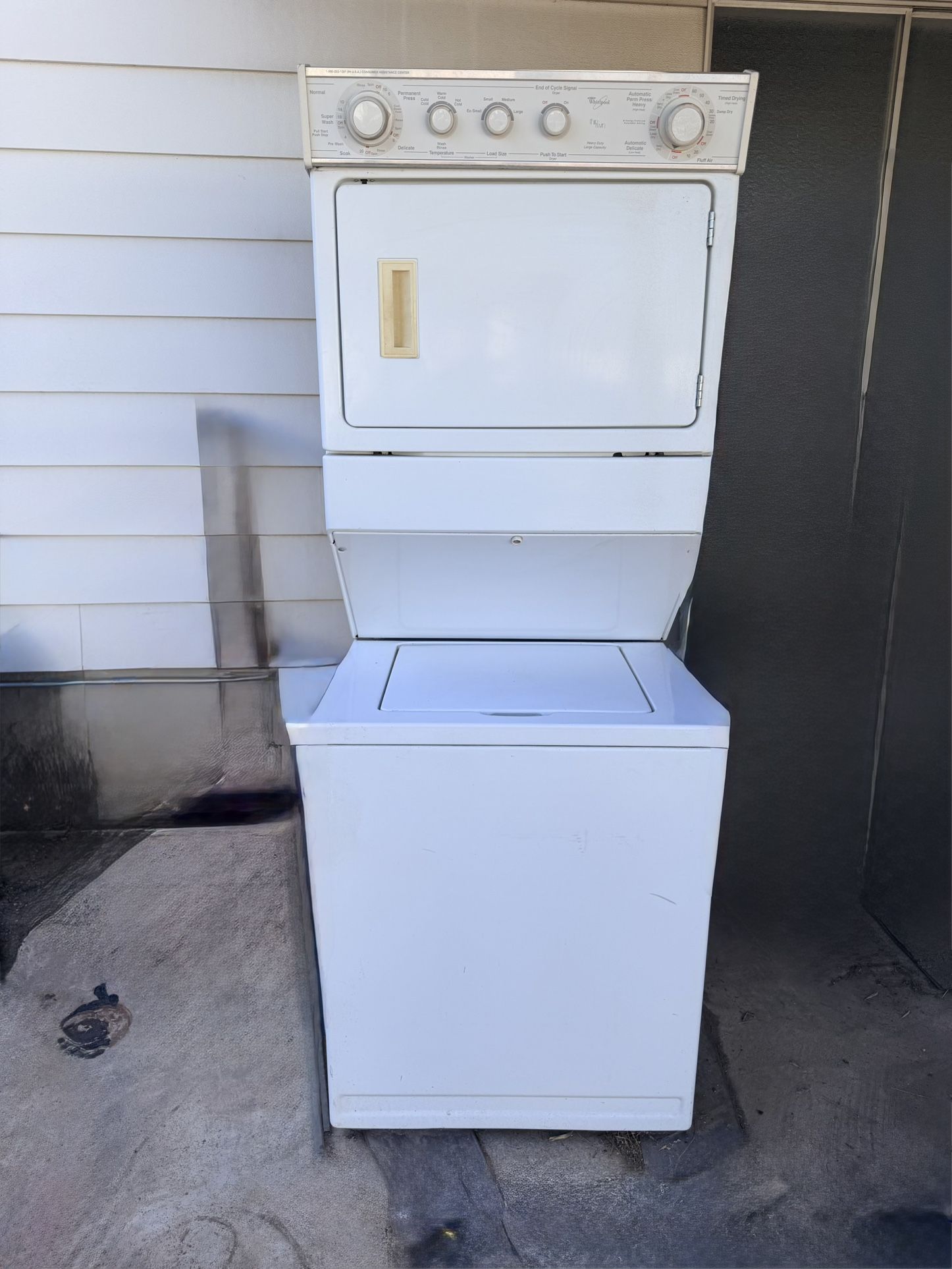 Stacked washer dryer. Has a great agitator in there for a nice clean Large heavy duty capacity Washer below dryer on top
