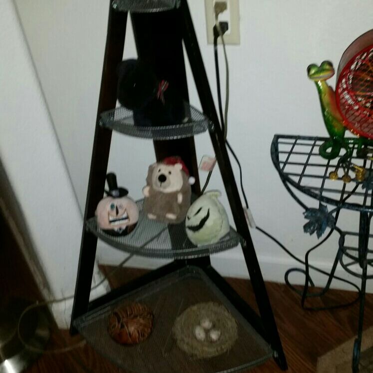 A Rubbermaid Four Tier Corner Storage Shelf