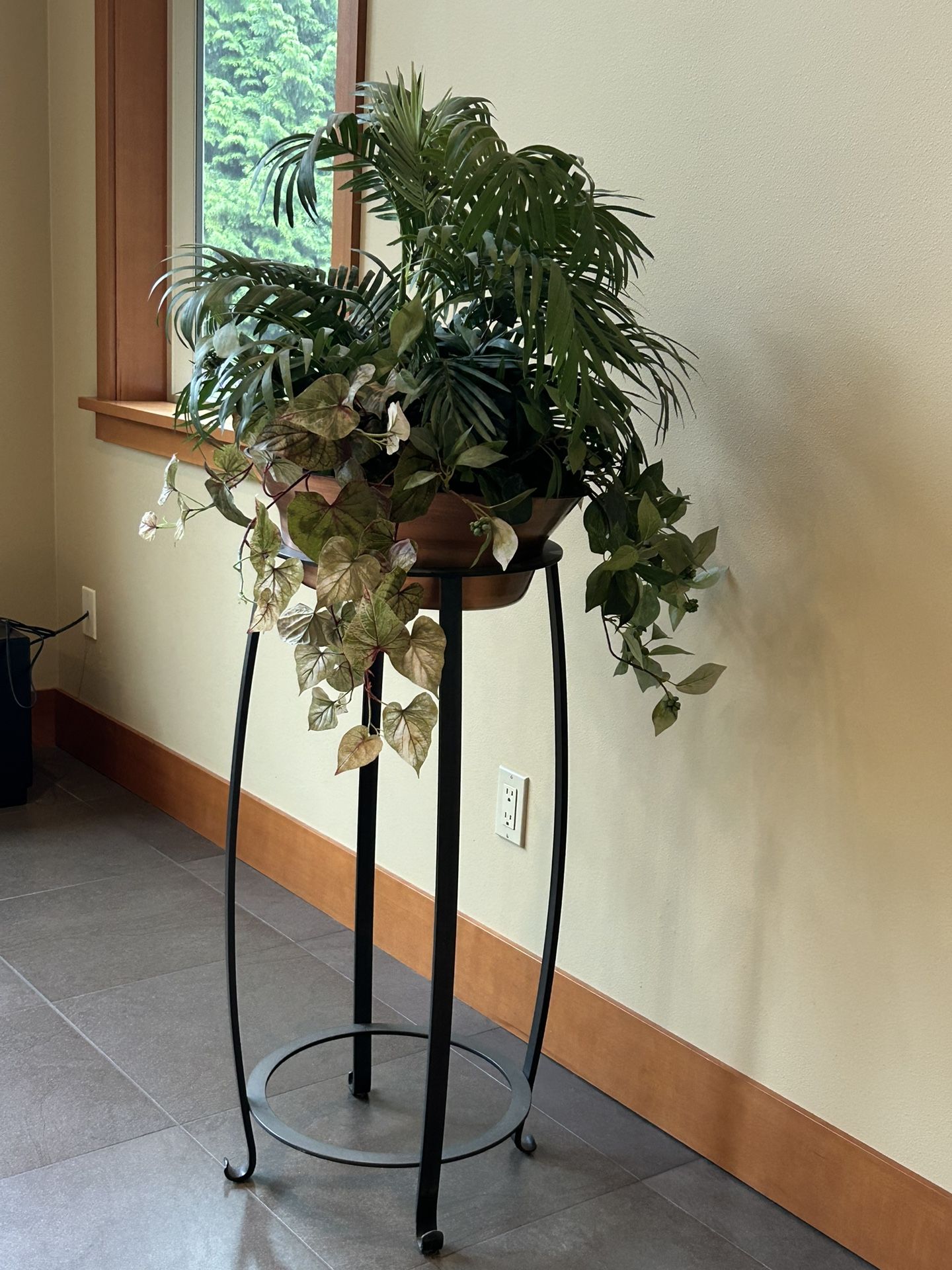 Copper bowl with wright iron frame & legs, includes artificial plants. Excellent condition, always used inside. Stand 37” tall x 18” wide 57” tall w/plants
