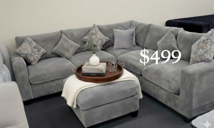 Gorgeous! 4-pc Sectional Sofa With Ottoman Grey Corduroy