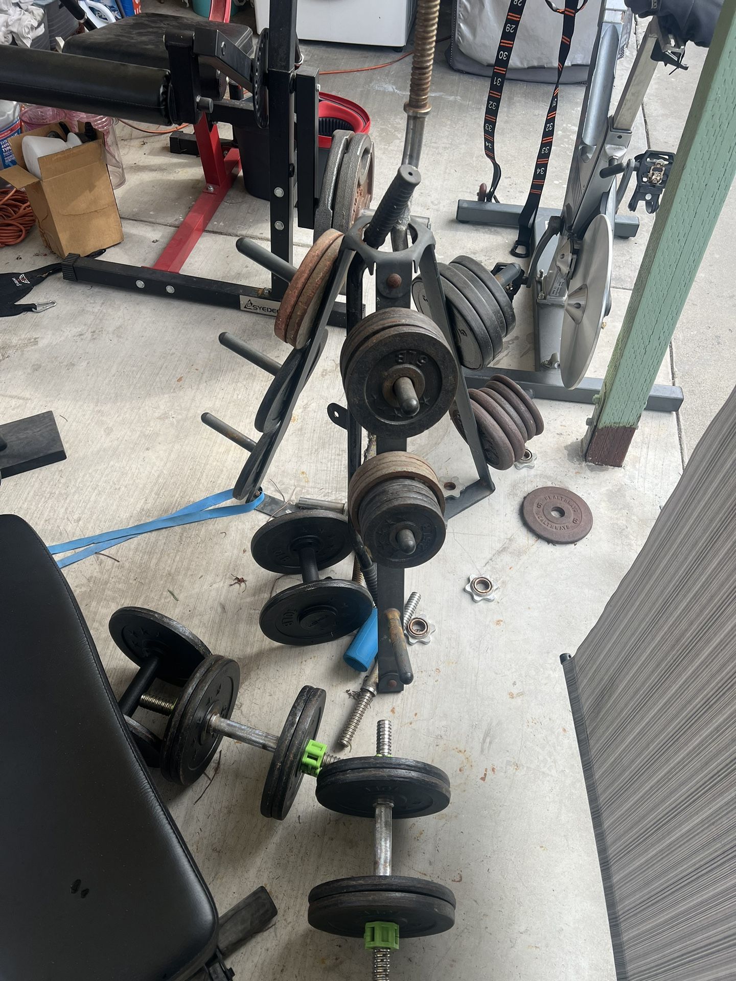 Comes wirh 6 handles and 1 ez curl bar and weight trees, over 200lbs of weight ranging from 2.5,3,5,10.