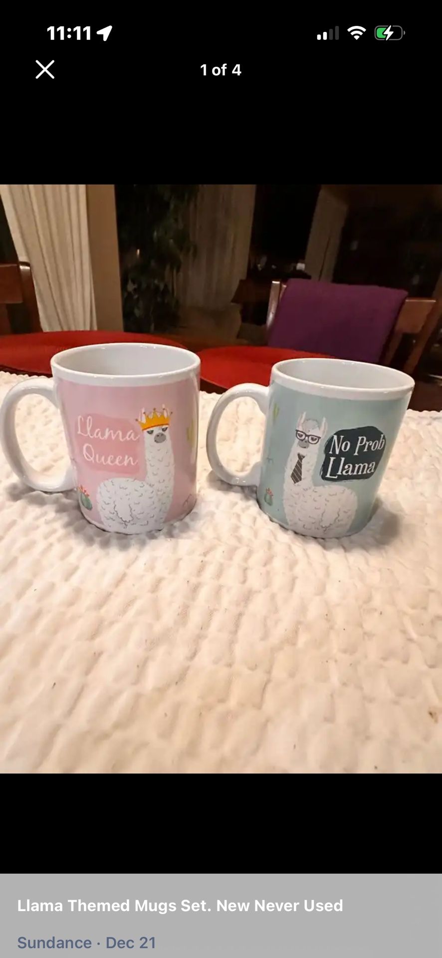 Llama themed with cute sayings , set of two mugs with a different comment on each mug. Pink mug for llama queen, blue for a no problama llama. The mugs have never been used. Hope to find a new home. We are located in North County, Rancho Peñasquitos, zip 92129 Cash only. Thanks, Beve DISCOUNTED To Sell $5 for the pair!