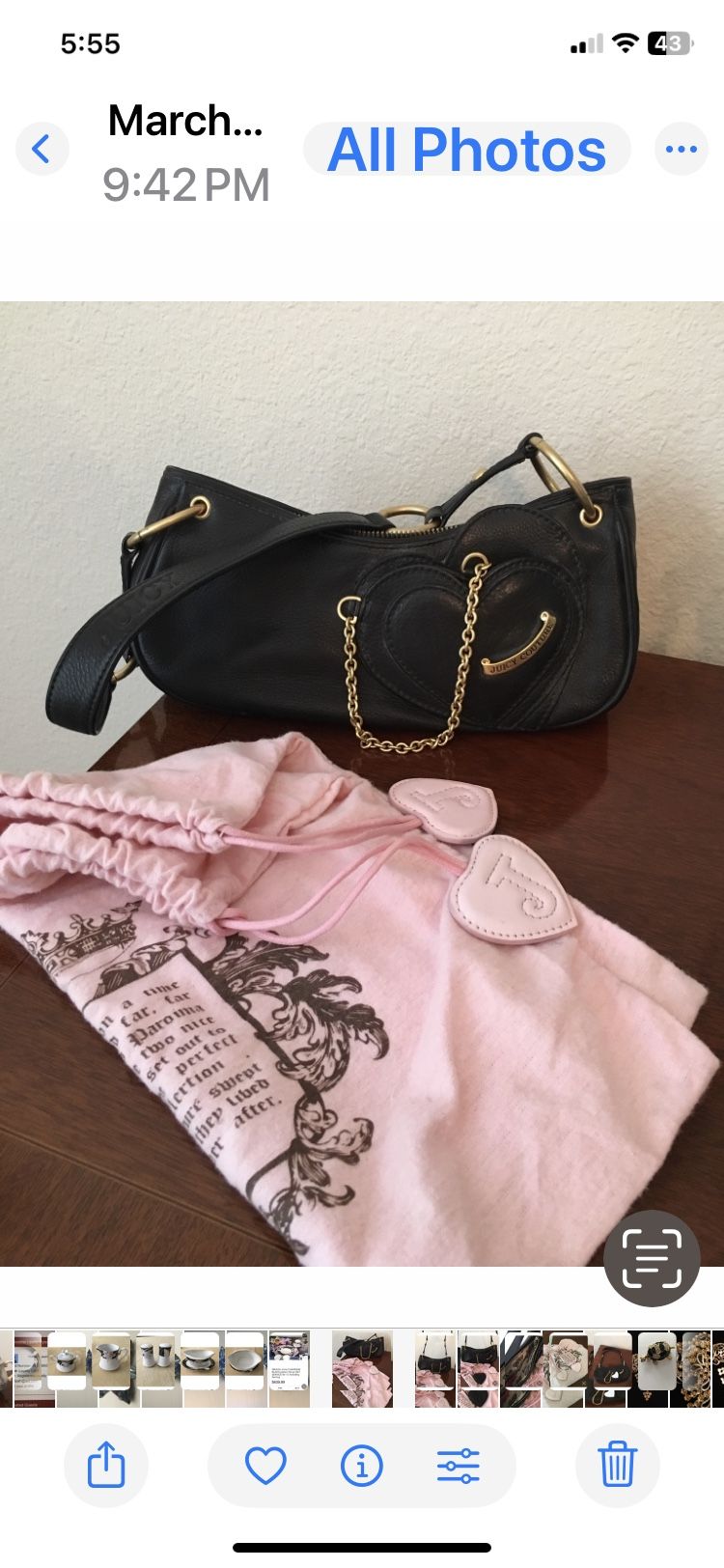 Soft leather in black with heart accessory mirror in pristine condition. Comes with pink Juicy dust bag. Selling for just $25 with an additional $300 purchase. Offers considered as well.
