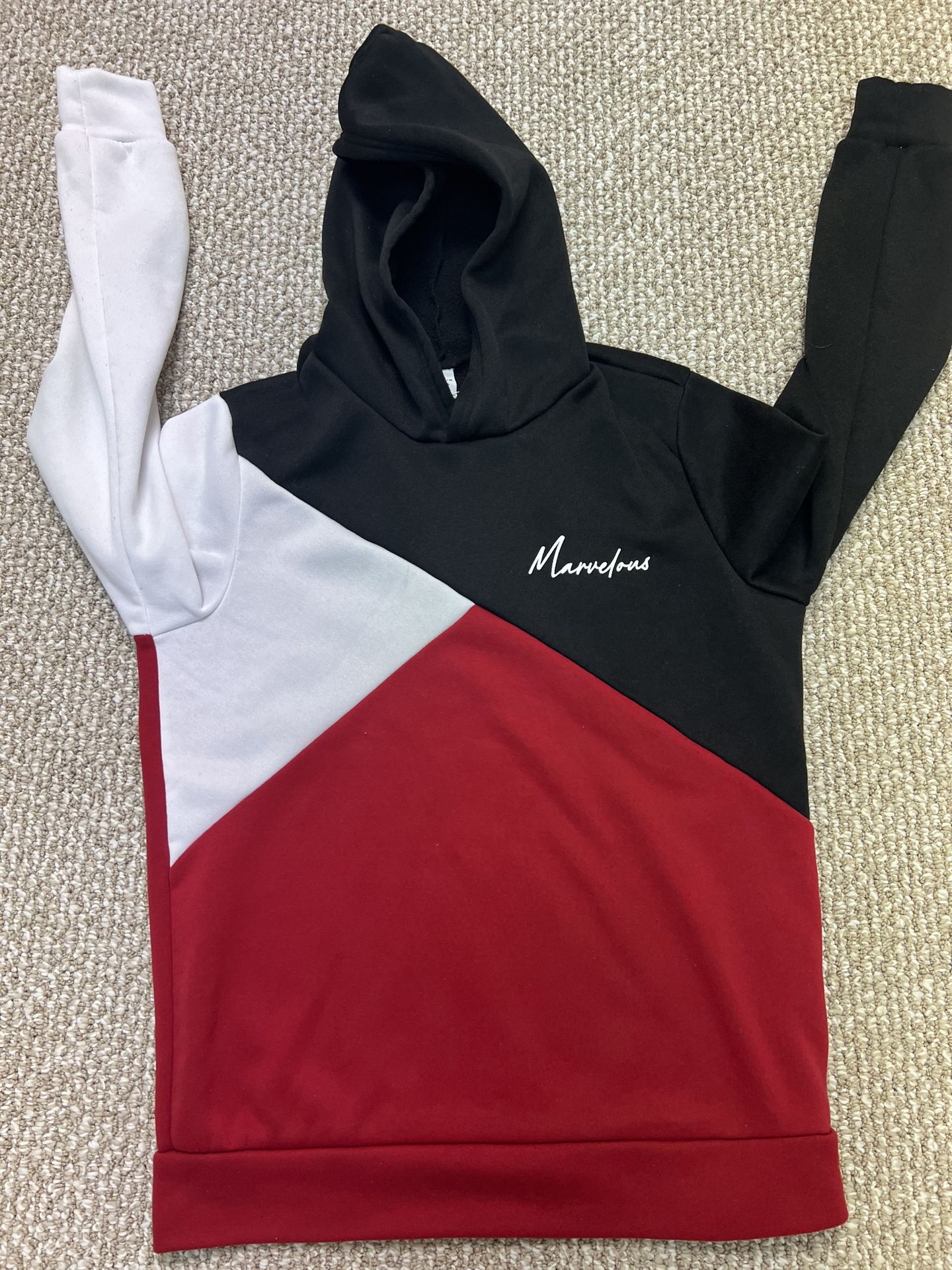 SHEIN teen pullover in solid black, red & white blocks. Soft textured fabric with classic hoodie design. Minimalist branded label at neckline. Simple casual piece for everyday wear.
