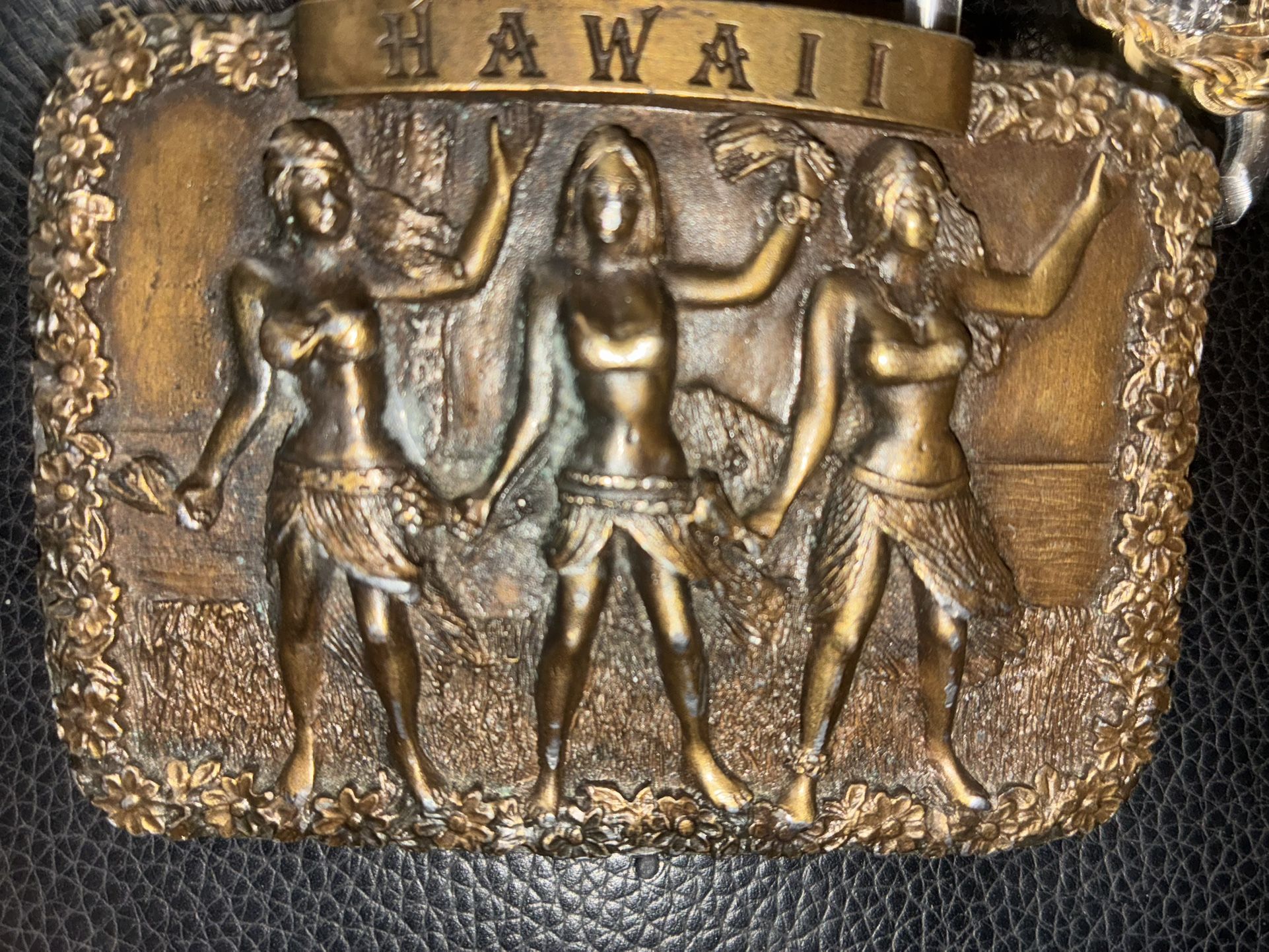 Vintage Hawaii hula dancers belt buckle A little oxidation on back size but can clean and wipe off no problem Brass collectors edition belt buckle Made in U.S.A Original not a Chinese remake