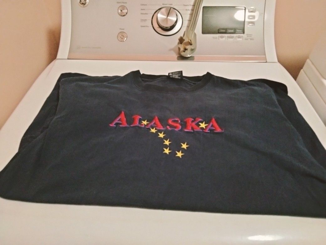 One extra large men's Alaska graphics tee shirt short sleeves. Navy blue background. 100% cotton. Good used condition. REDUCED PRICE: WAS $5.00 NOW. $3.00 Pickup is in millersville Pennsylvania.