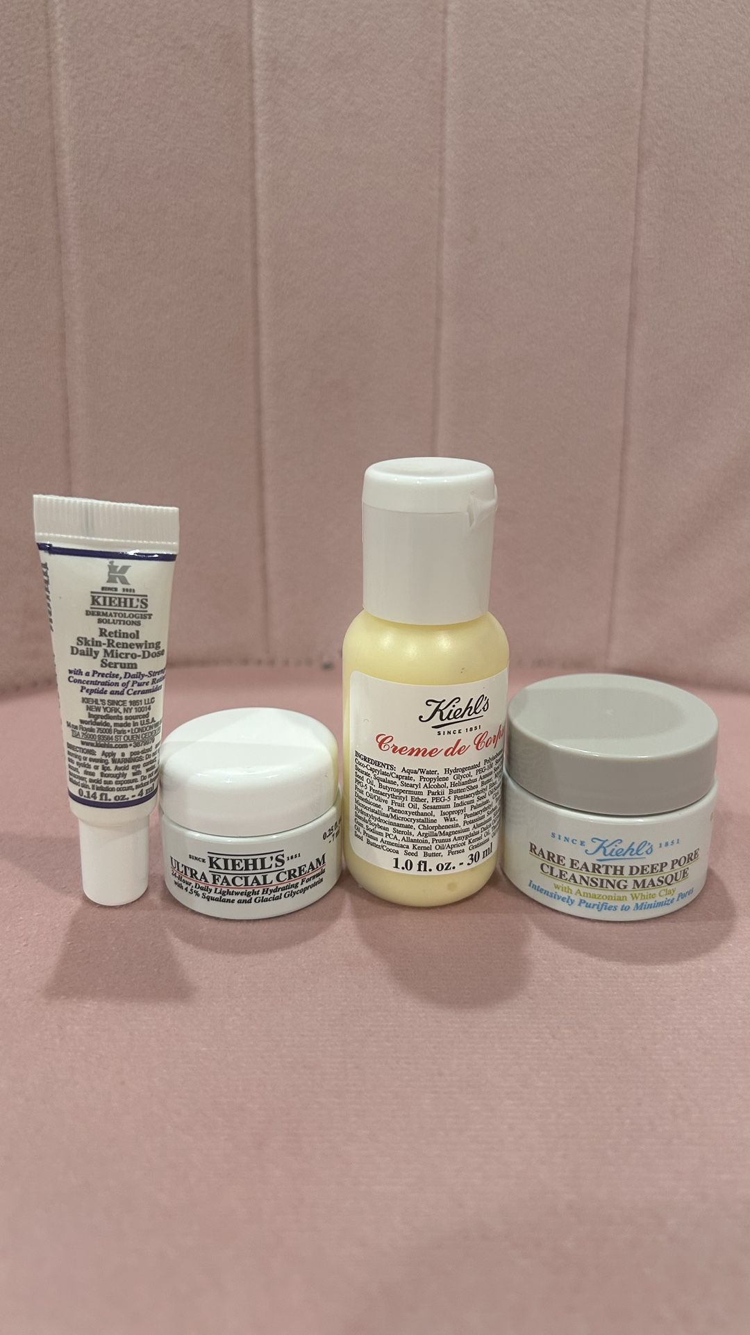 Kiehl’s mini travel bundle : - Deep Pore Cleansing masque - Retinol skin- renewing daily micro serum - Ultra facial cream - Cream de Corps - Make up bag
