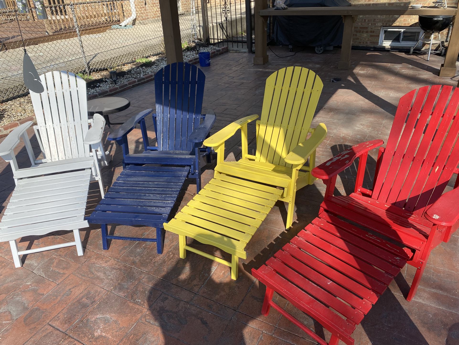 4 wooded patio chairs with pullout leg rests. Needs cleaning and paint touch up. I have the leftover red, blue and yellow