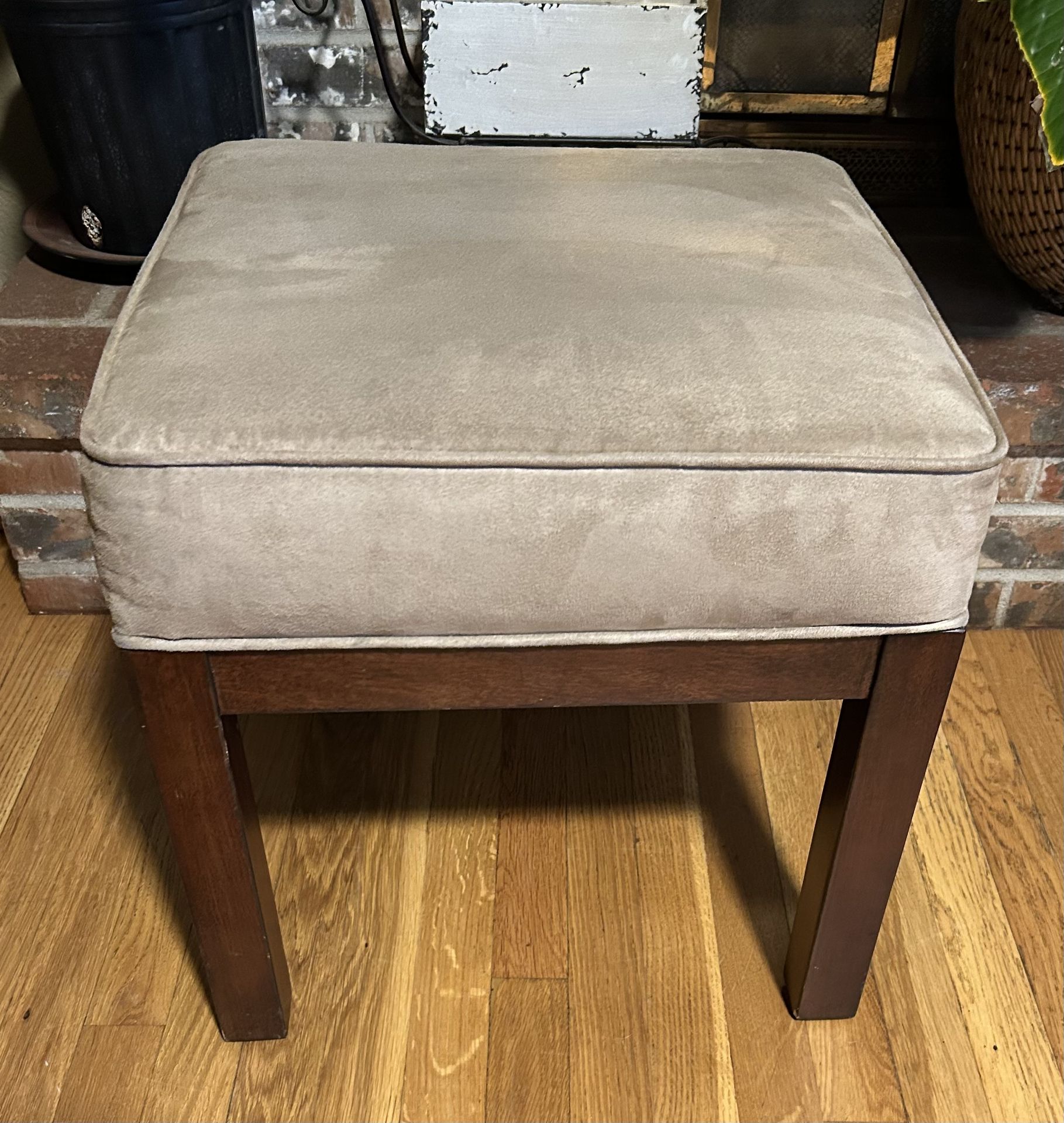 Neutral upholstered ottoman. Has beige fabric. Dark wood legs. Great for extra seating or putting your feet up. 18”x18” Width 1’ft 7”Height Pick up in Brush Prarie Cash FCFS If it isn’t SOLD, it’s still available. I won’t respond if asked.