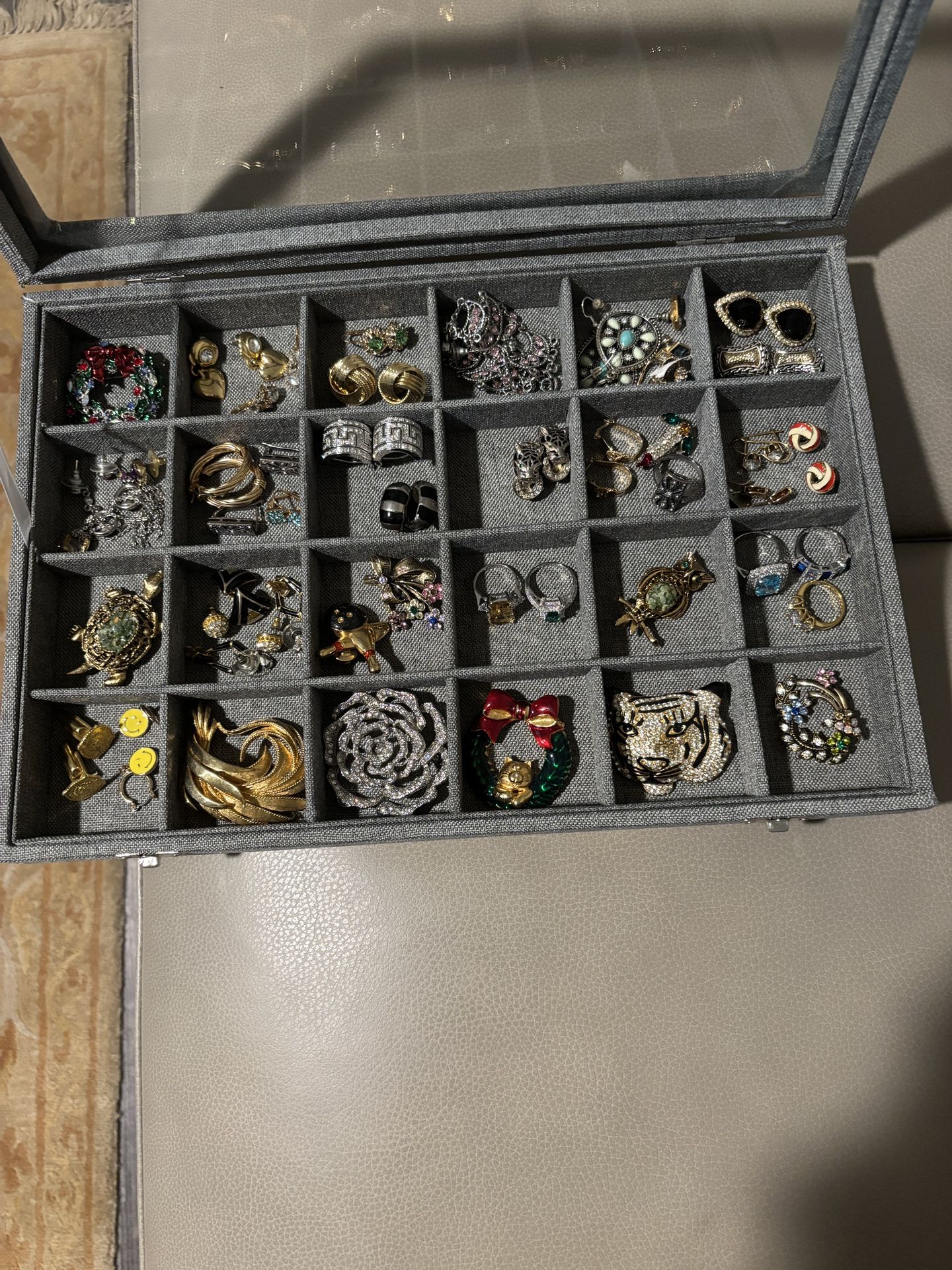 Around 47 Sets Among Rings, Earrings, Brooches. All In Good Condition Displayed In a Jewelry Box.