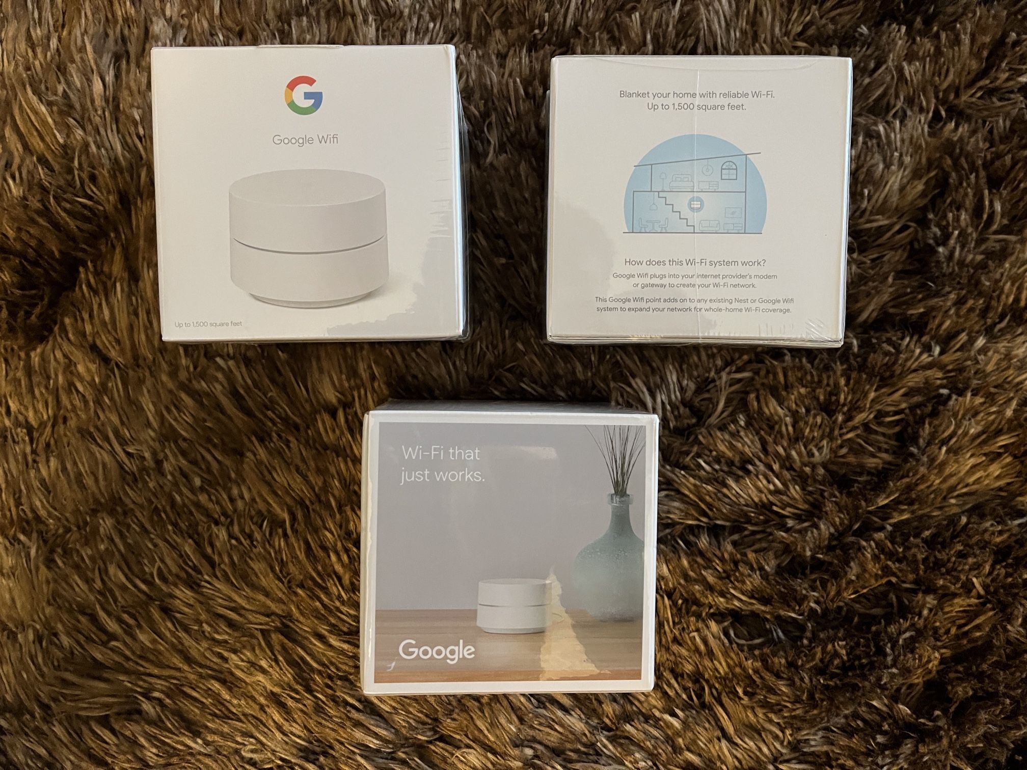Edit: just one left! Firm price, $150 for all 3. OR $60 each. Priced to sell! Only 3 available. Features: - Stream with speed. AC1200 per point. Intelligently works behind the scenes to make sure your Wi-Fi remains fast.* Walk from room to room on a video call with an uninterrupted signal. A Google Wifi 3 Pack covers most homes and gives you faster speeds for your home. - Simple setup in a few steps. Connect the Ethernet cable to your Google Wifi point’s WAN port and connect the other end to your modem. Plug your primary Wifi point into an electrical outlet. Then use the Google Home app to create your network and get online in minutes. - Designed for your home, and the world around it. Google Wifi is sustainably designed, with 49% of its plastic parts weight made with recycled materials. - Parental peace of mind. Parental permissions let you set schedules to manage screen time, restrict certain kinds of adult content, and pause Wi-Fi specific devices whenever you want. - 2 gigabit Ethernet ports. Built in 2 port ethernet available on the router. - Your home, your way. Google Wifi is easy to set up with the Google Home app, you can add and manage your network in one place.* Check your network speeds from anywhere with your smartphone. Easily create a guest network and share your password in just a few taps.** - Thoughtfully designed, inside and out. Google Wifi respects your privacy. It doesn't track websites you visit and will never sell your info for advertising. - Security that's a step ahead. It automatically updates itself to get new features and help your network stay safe.