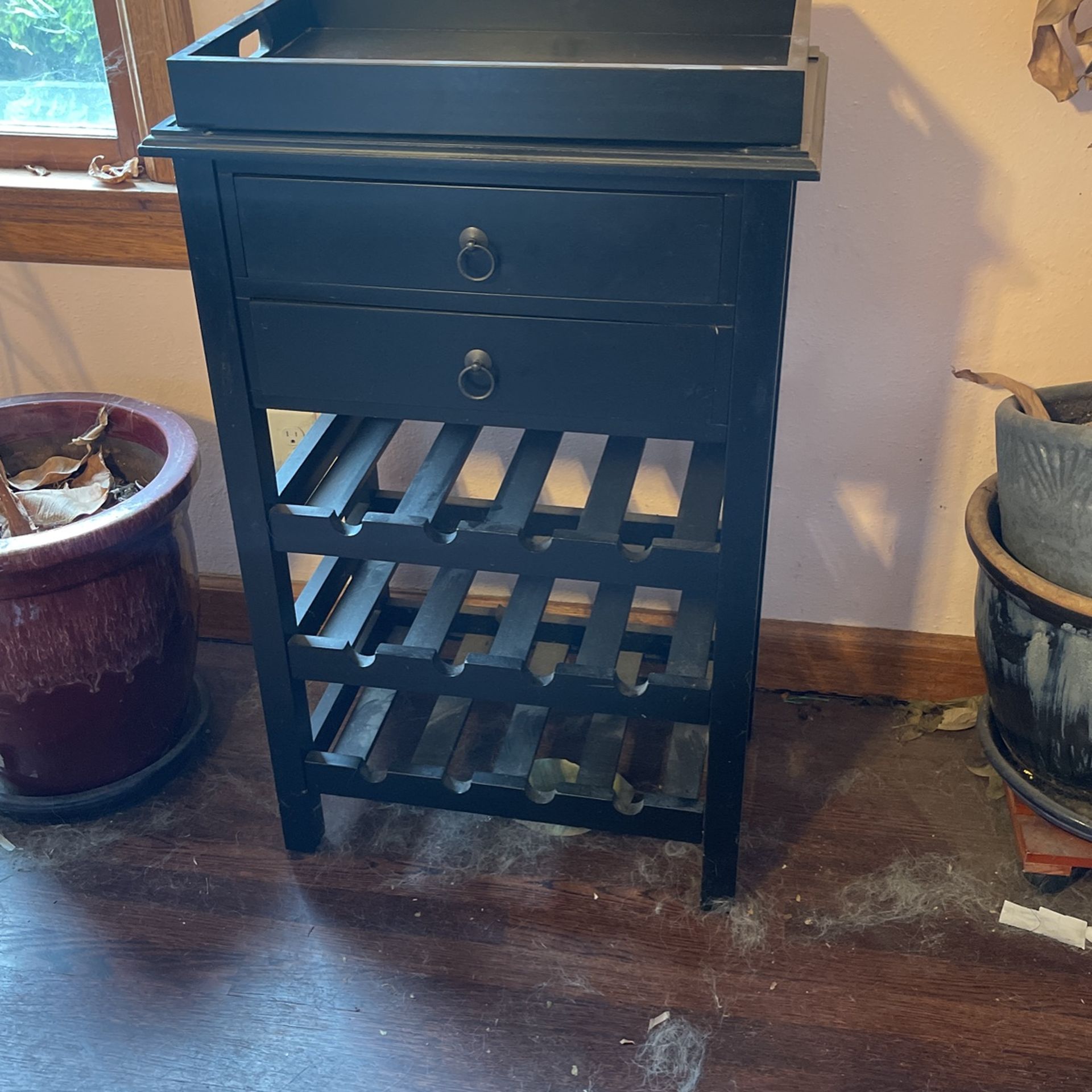holds 12 bottles ofceine. wood/veneer, black. both drawers work.