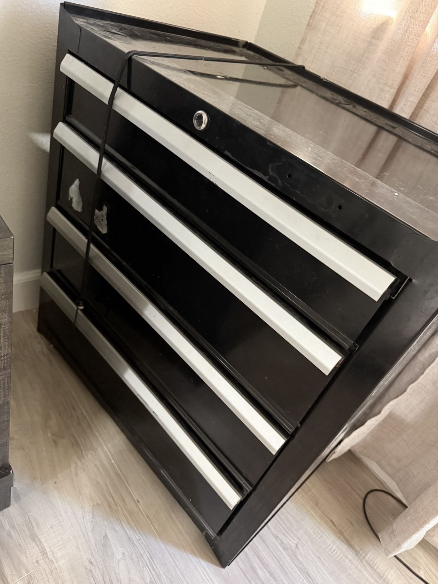 It’s works just doesn’t have the wheels installed but they’re inside the drawer. The only thing wrong with it is the lock.