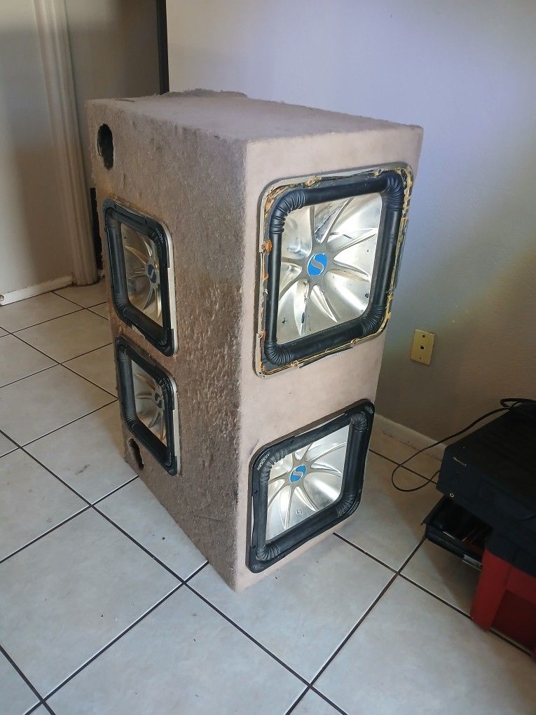 I have 2 15" squares L7 and 2 12" squares L7 in 1 box, box is in good condition,all speakers in box work perfect n good condition, 1 15 in box does have foam from old owner not forsure why but never had problems with them works fine, pics shows all speakers in box n last picture is 2 extra 15" kickers squares L7 only the black 1 works other 1 doesn't just extra parts cant post more pics so just ask for more im asking 700$ o.b.o in totally 4 15" n 2 12"