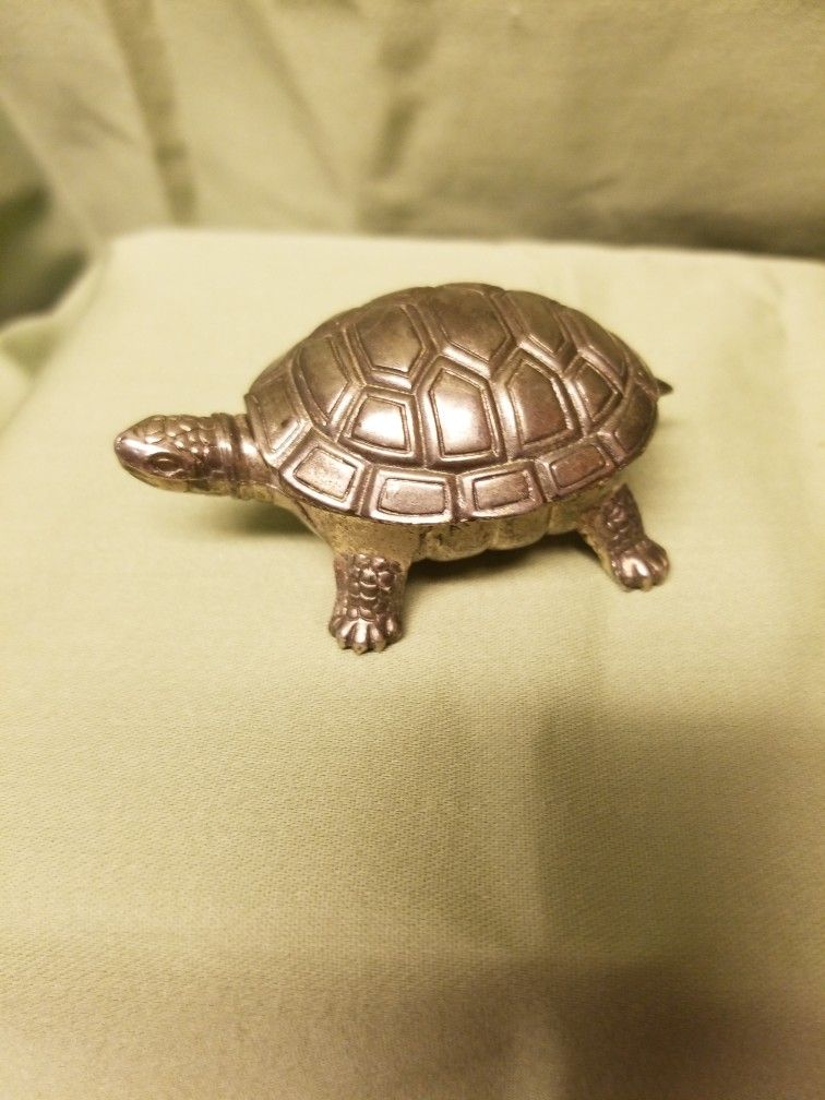 This is a 2 3/4 in long silvertone turtle trinket box. It has an ivory colored liner . $10 OBO cash only please