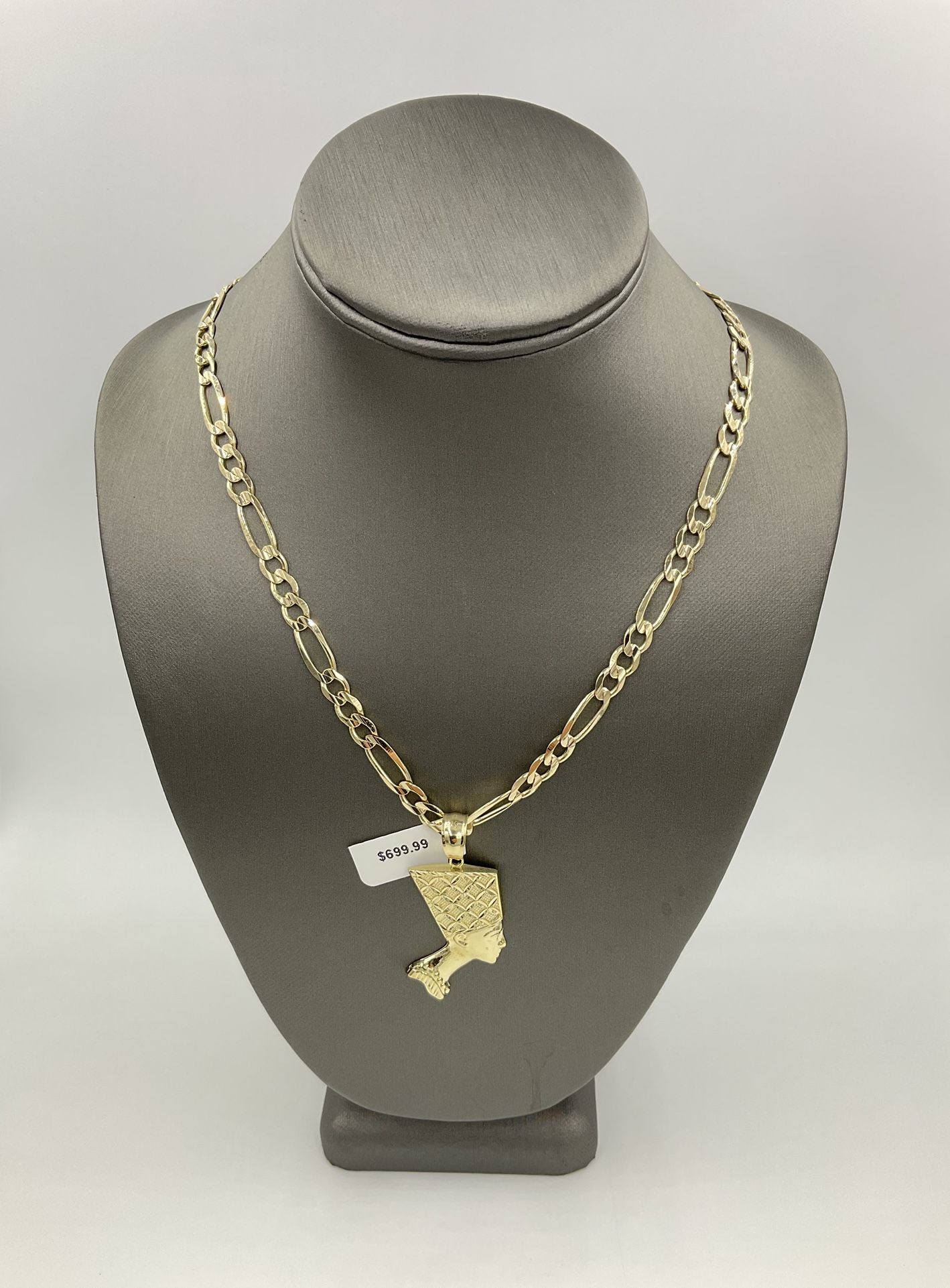 10KT YELLOW GOLD 22.5” FIGARO LINK CHAIN 25.4GR 6.25MM W/ 10KT NEFERTITI CHARM 4.7GR
