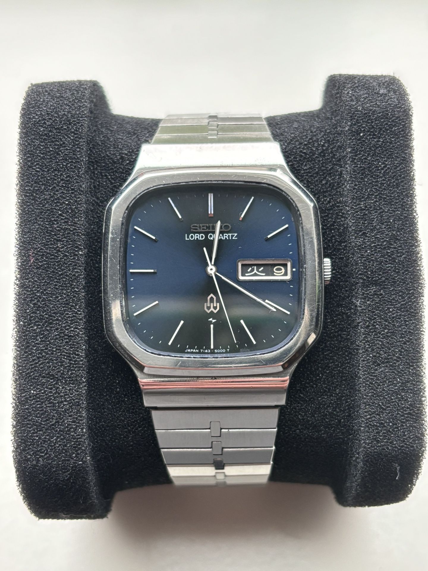 Vintage Seiko Lord Quartz featuring a blue dial in great condition. Light fading present between 11 and 1. Dual-language day display (English/Kanji). Service history unknown; runs accurately.