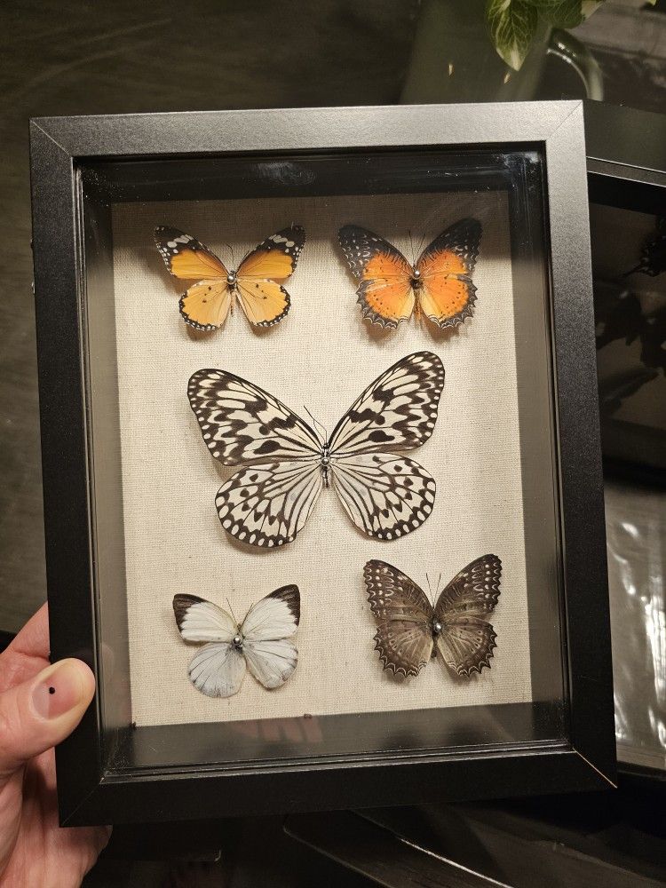 Framed Butterfly Display β 8x10 Shadow Box Stunning handcrafted butterfly display, featuring five beautifully preserved butterflies in a sleek 8x10 shadow box. Each specimen is ethically sourced and carefully mounted on a neutral background to highlight its natural beauty. π¦ Species Included: β¨ Danaus chrysippus (Plain Tiger) β Vibrant orange with black and white markings. β¨ Cethosia cyane (Leopard Lacewing) β Striking orange with a delicate lace-like pattern. β¨ Idea leuconoe (Paper Kite) β Large black and white butterfly with an elegant, airy pattern. β¨ Appias albina (Common Albatross) β Soft white wings with subtle blue undertones. β¨ Junonia iphita (Chocolate Pansy) β Earthy brown with intricate markings for a natural aesthetic. Perfect for home dΓ©cor, gifts, or collectors, this piece brings the delicate beauty of butterflies into any space. Securely sealed to protect from dust and damage. π Local pickup in Bakersfield π² Price: $120 π© Message for availability!