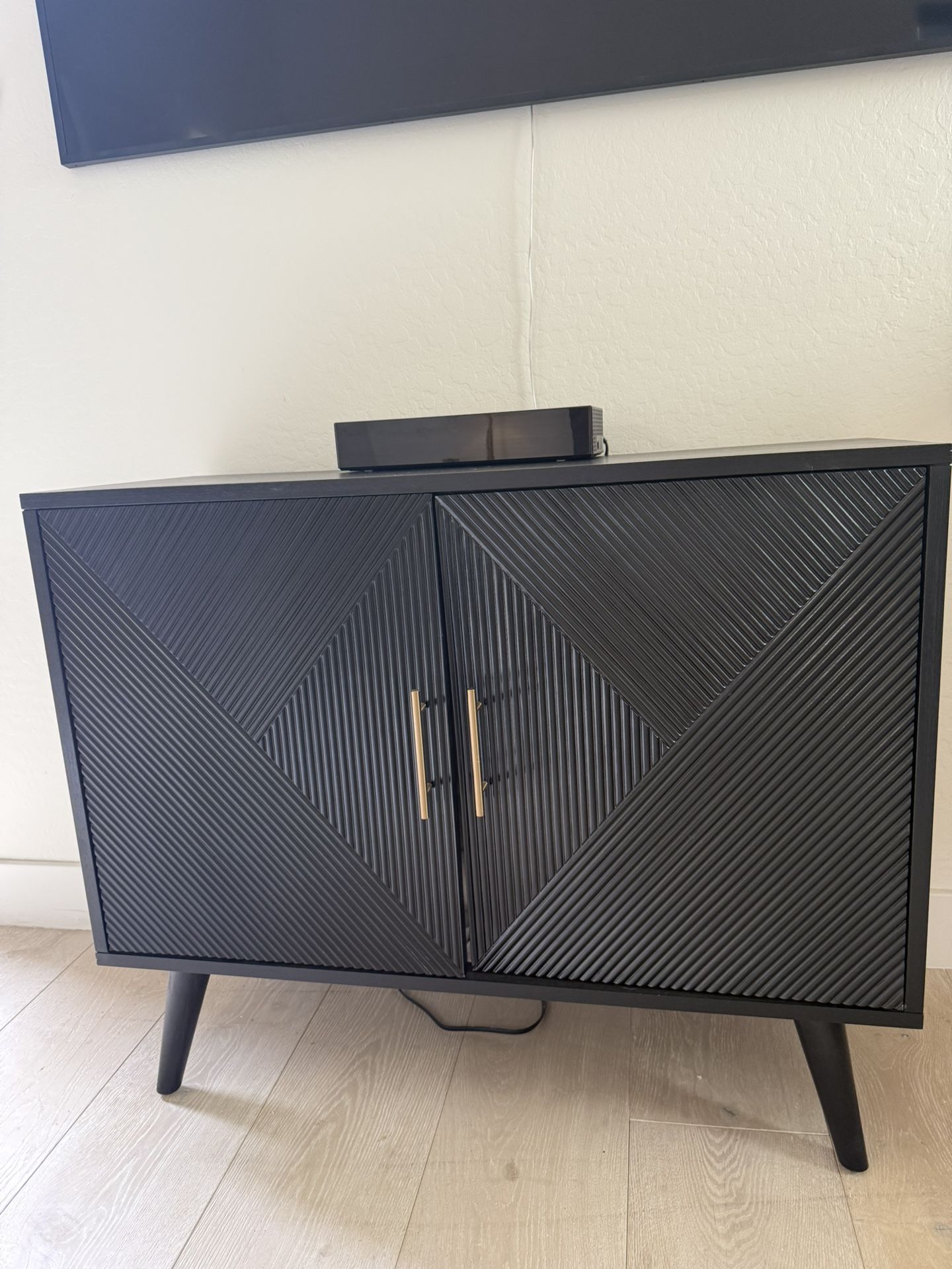 This beautiful black and gold bronze hardware sideboard is in mint condition. Not a single chip or scratch. The interior shelving is still in original packaging. Item has been in our guestroom that has not been used. Room is being converted to a nursery and the items need to move ASAP. Measurements in photos
