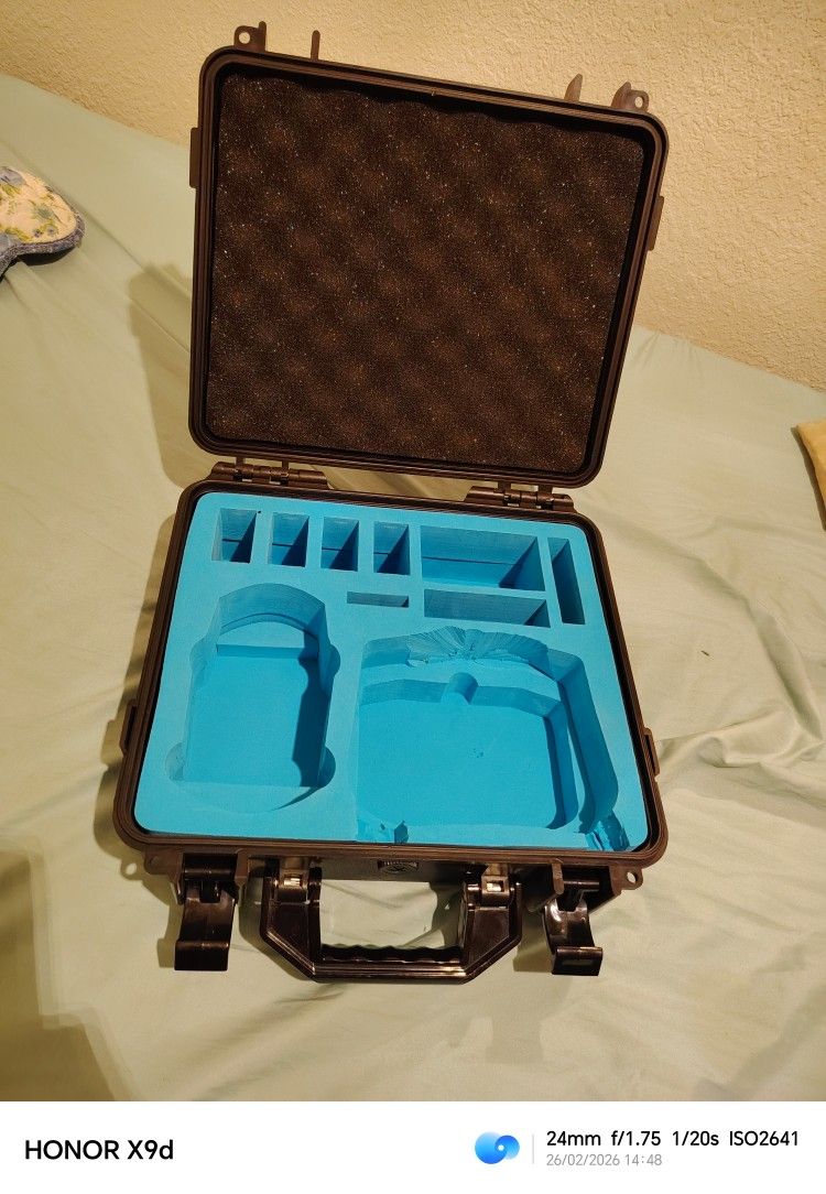 Military-grade protection for your investment. I'm selling a heavy-duty hard case designed specifically for the DJI Mini Pro series. The interior features high-density, bright blue technical foam, laser-cut for a perfect fit for your drone and accessories. What fits (perfectly organized): Drone body (Mini 3 Pro or Mini 4 Pro) with propellers folded. Remote controller (DJI RC 2, DJI RC, or RC-N1/N2). Up to 5 batteries (1 in the drone + 4 in dedicated slots). Bidirectional charging hub. Space for cables, spare propellers, ND filters, and a screwdriver. Additional features: Ultra-resistant shell against impacts, dust, and water. Automatic pressure equalization valve (ideal for air travel). Easy-to-open yet secure double-action zippers. Lid with "egg-crate" foam for superior padding. Condition: Excellent / Like new. Photos show the perfect fit. Fly with peace of mind knowing your gear is protected!