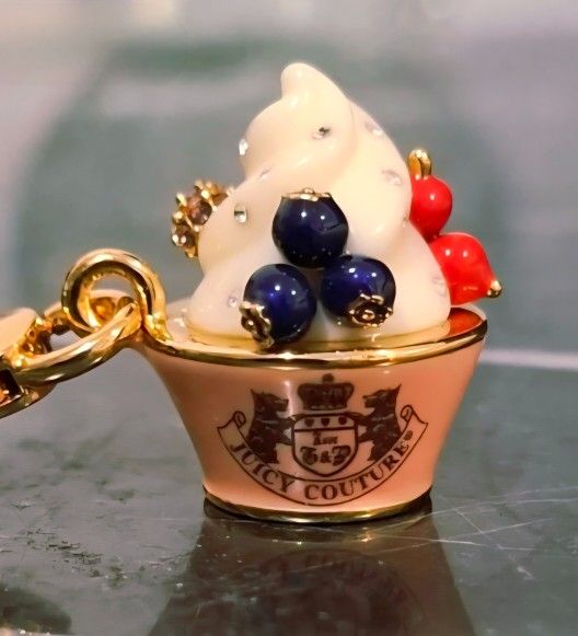 vintage Juicy Couture yogurt fruit & cream charm, with White chocolate chip 💎rhinestones, and a gold-plated base with a white enamel swirl top. PERFECT 4 THAT HARD -TO- GET - FOR PERSON. And perfect 4 avoiding ' repeat gift syndrome' .......in time before this holiday🎄rush Use for: necklace📿 Keychain🔑 Barbie accessory🎀 -Not sure what 3 sell for...going with best offer..