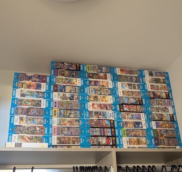 Over 50 puzzle's.Each one is a 1000 pieces. All only used one time.All pieces are there. Mostly Buffalo games brand.Aimee Stewart,Eric Dowdle,Chuck Pinson.Abrsham Hunter.Pretty scenic and nature.Some are easy some are harder. $5.00 each or make offer.Feel free to come by and check out , Mostly age 14 and up