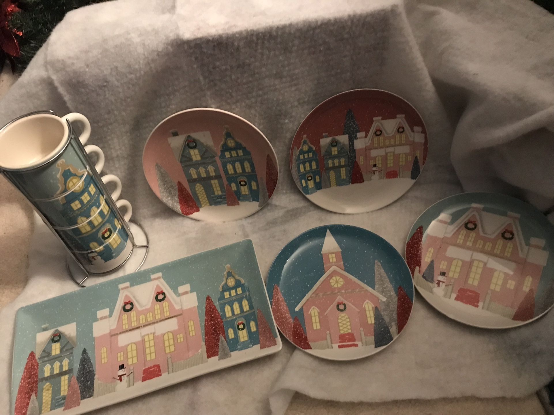 From Pier 1. Set of 4 plates, serving plate, and stacking coffee cups. Never been used. Perfect condition.