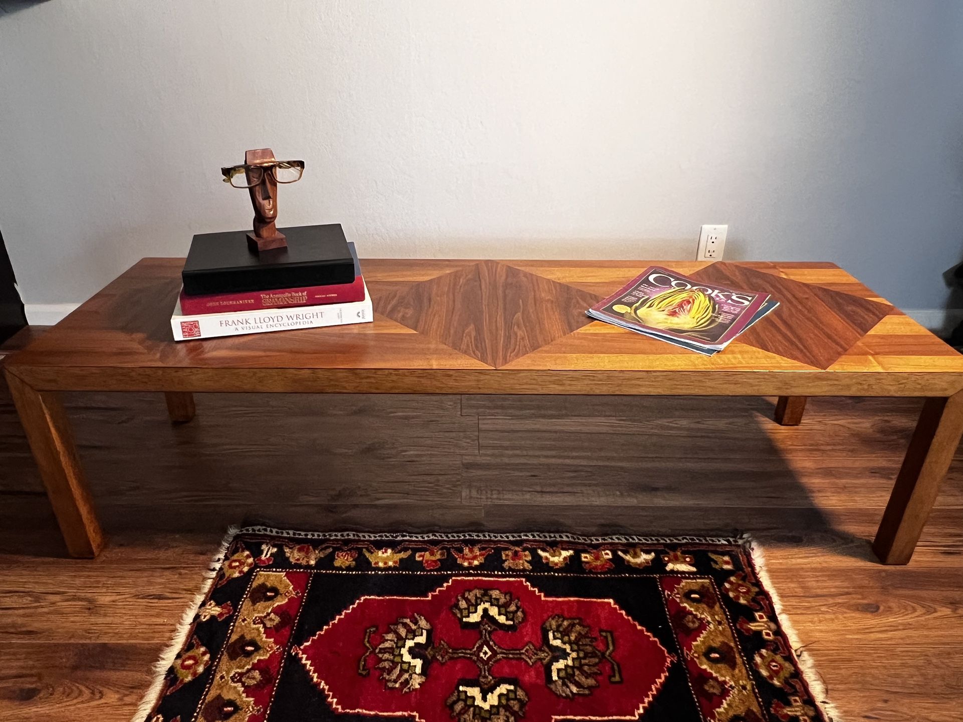 Beautiful, rare, walnut parquet Lane Parsons table. Refinished to enhance the natural beauty of the wood, this vintage piece is the ultimate in mid-century modern style. Manufactured in 1972 and ready for the next 50 years. Triple-sealed for extra protection. Free local delivery 40 miles from Monterey. Curbside delivery to bay area for gas and tolls.15"H 19" W x 57" L
