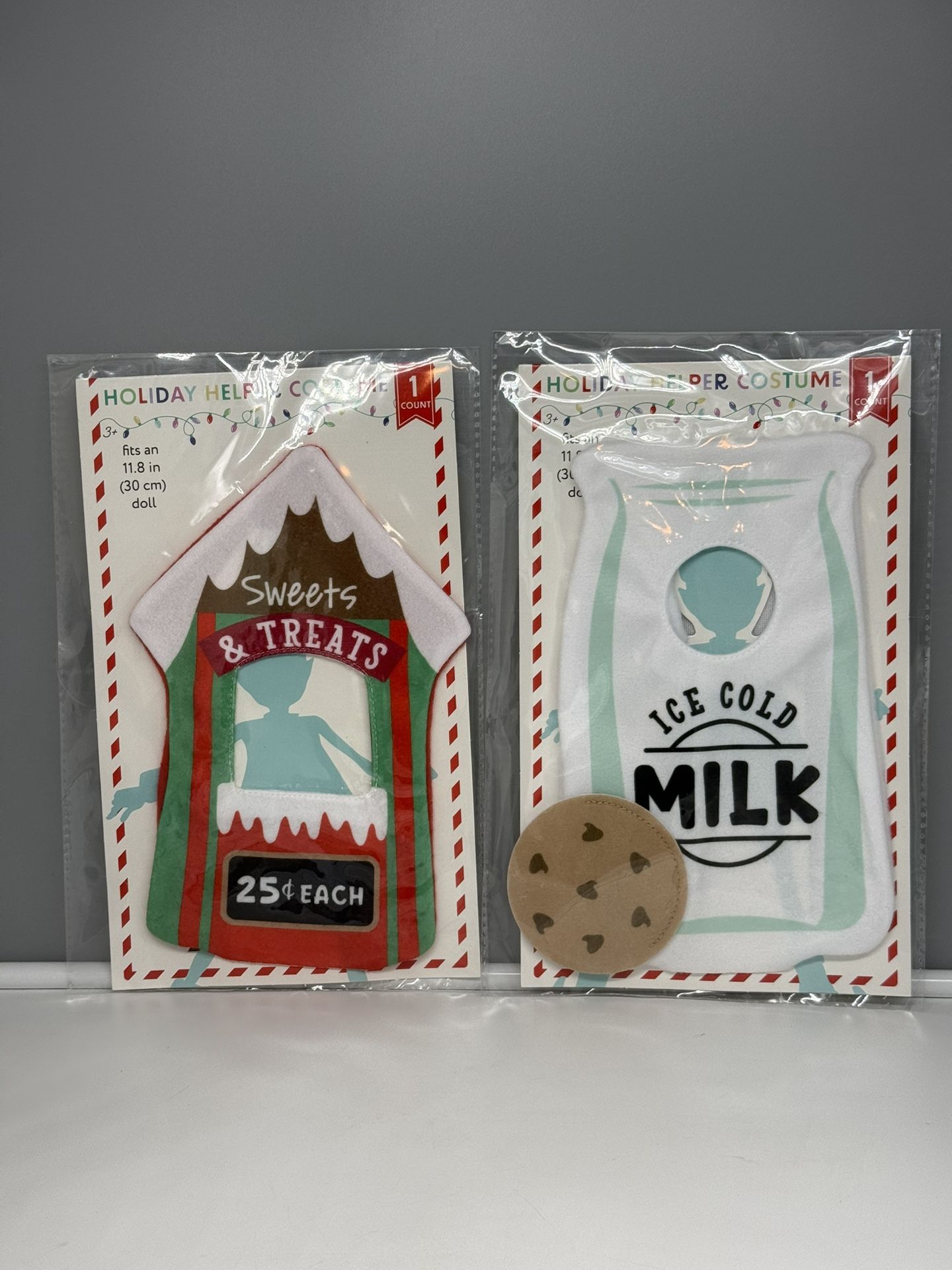 These doll costumes are Holiday Helper outfits designed for 11.8-inch (30 cm) elf dolls. The set includes themed outfits "Ice Cold Milk" bottle costume. "Sweets & Treats" stand costume.