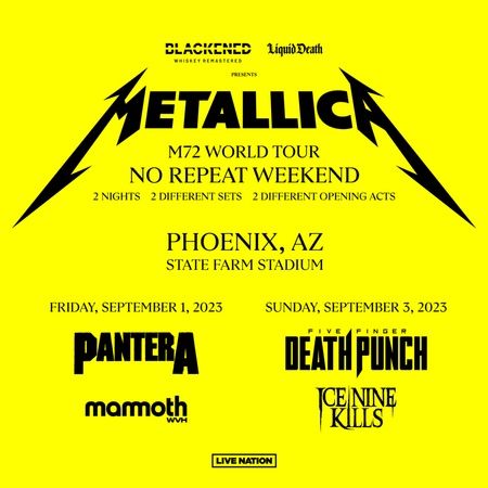 We bought two day general admission floor tickets to see Metallica for my bachelor party this weekend but we decided we didn’t want to go to the second day on Sunday they are playing with Five Finger Death Punch we have 6 total available we can meet on Saturday to deliver asking 300 bucks each let me know if you have any questions for know anybody who might be interested thanks!
