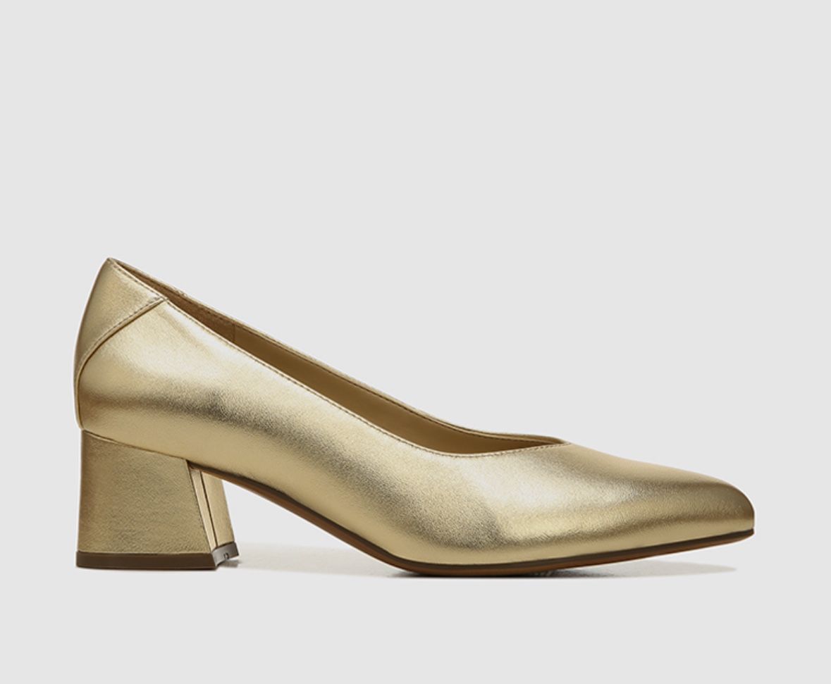 New Without Tags of Box - NWOT Naturalizer Malynn block heel pump in metallic gold leather Size 6w Chic comfort all in one style? Look no further. This thoughtfully crafted dress pump with a V-topline and pointed toe is so trend-forward. Get there beautifully. Refined dress pump with walkable block heel. Leather, metallic leather upper with a pointed toe. Slip-on fit. Contour+ technology for a premium fit and all-day comfort experience. Non-slip outsole. 2" block heel. Consciously packaged: 100% of our shoe boxes are made of 80% recycled paper + soy-based ink. Designed using sustainable materials. WHY YOU’LL LOVE IT: Ingenious elegant utility. All-day heels that scale the height of chic with endless versatility and comfort that is downright clever. Heel Height-Mid Heel Toe Shape-Pointed Toe Heel Shape-Block Heel Upper Material-Leather Sole-Eva
