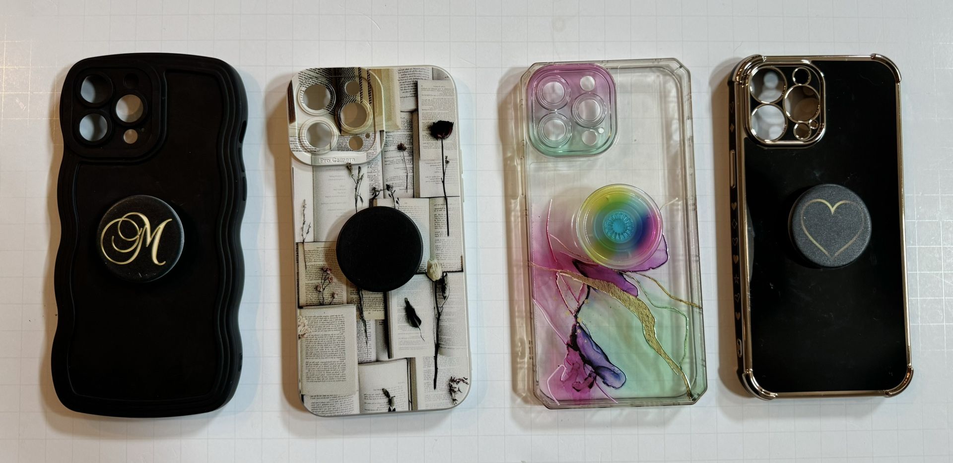 20 cases - 5 w/pop sockets, 4 with rings/phone holders, two with card holders 6 screen protectors - new never used Cases in great condition with the exception of two that had the pop sockets removed CASH ONLY