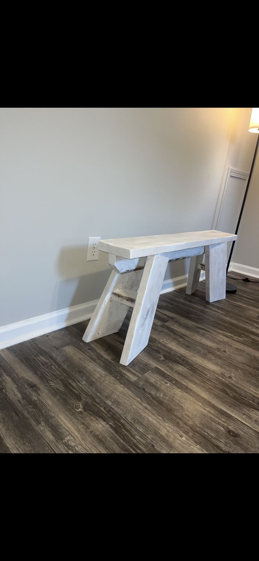 Handmade farmhouse-style bench, solid wood construction with a whitewashed / distressed finish. Clean lines with angled legs give it a modern rustic look. Super sturdy and perfect for an entryway, mudroom, hallway, or at the foot of a bed. Plenty of clearance underneath for shoes or baskets (see photos). Neutral finish works with almost any décor. Details: • Solid wood, handmade • Whitewashed farmhouse finish • Angled leg design • Very sturdy • Great for entryway, mudroom, or hallway • Condition: Excellent / like new Approx. Dimensions: • Length: 48in • Depth: 7.25 • Height: 19in Pickup: Local pickup only Price is negotiable feel free to make an offer Cash / Cash App / Zelle accepted