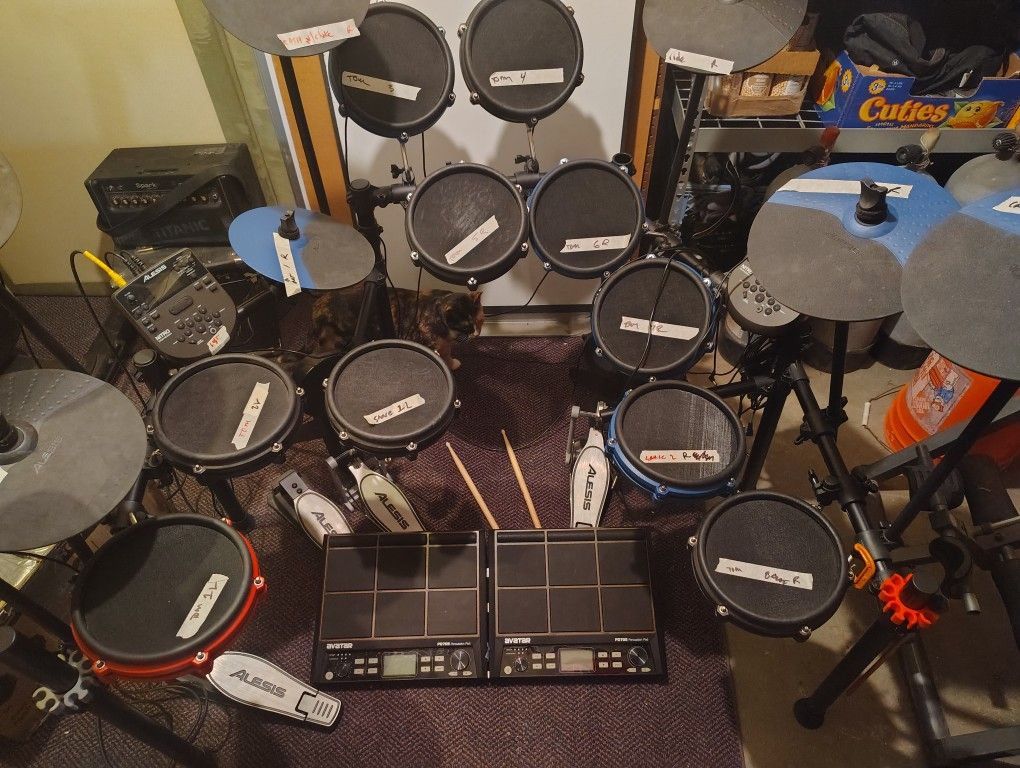 Includes 2x Alesis nitro mesh complete kits (black, blue), 2x Alesis nitro mesh expansion sets (black, red), 2x Avatar pd705 sample pads w custom rack mount. 1 kit lightly used, everything else like New! 1 tom pad has slight tear but works and can be fixed. Does not include throne, amps, or cat. Pick up only. Could consider splitting collection in half.