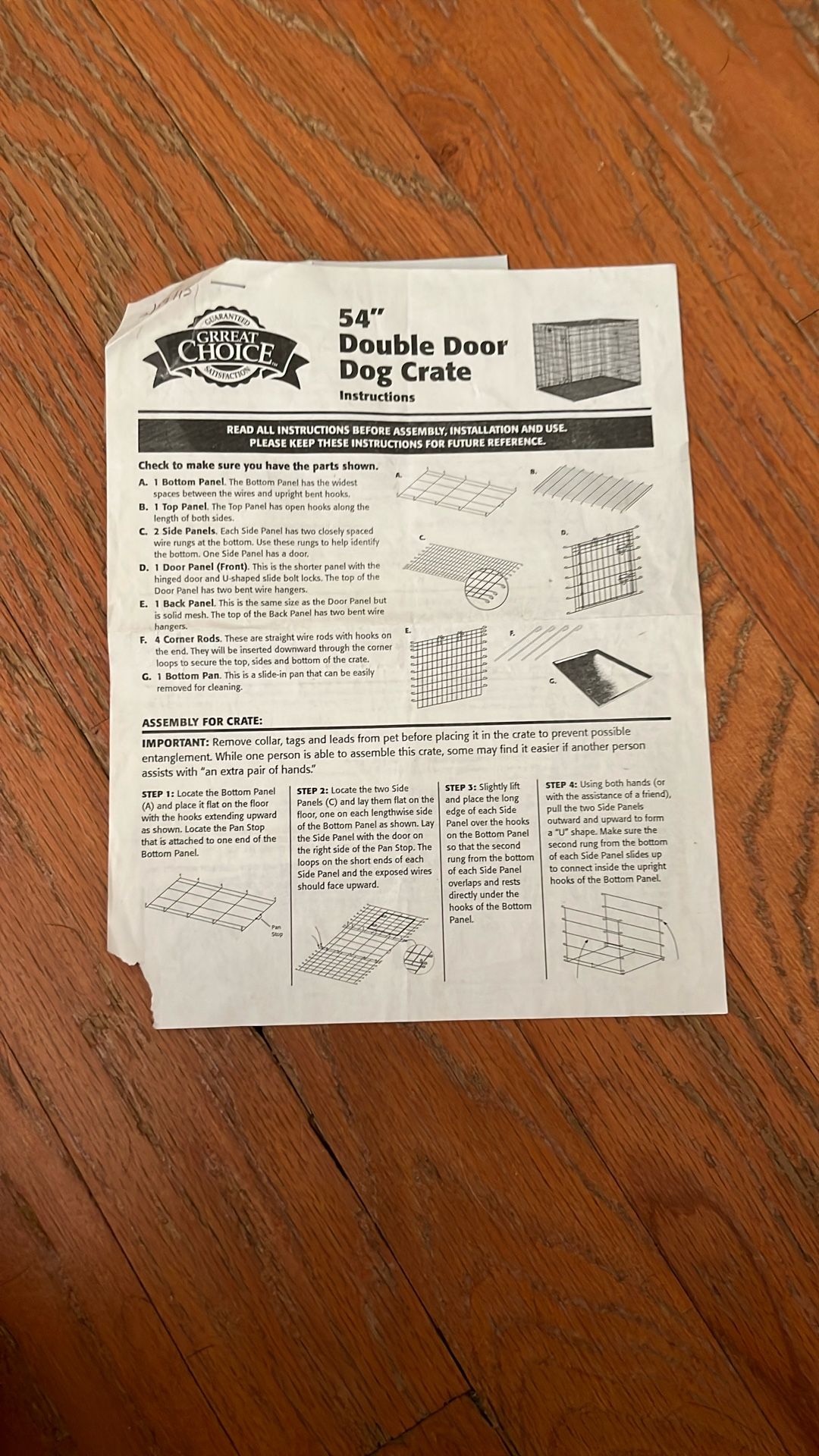 This is a very big rust proof wire dog kennel. It can easily hold a dog of 100 pounds or more. Great for German Shepherd, Collie, or any other large dog. It comes in seven pieces and can be collapsed and rebuilt whenever needed. Dimensions are 59 inches long, 36 inches wide, and 45 inches high. Like I said it’s a very big one. It has two doors. One door is on the short side of the kennel and the other is on the long side. There is a heavy duty plastic floor, so the dog is not laying on wires This was used occasionally for our dog who weighed about 95 pounds. Hope somebody can use this. Most of the large ones at pet stores are 45 inches long and they sell for about $120. This is larger.