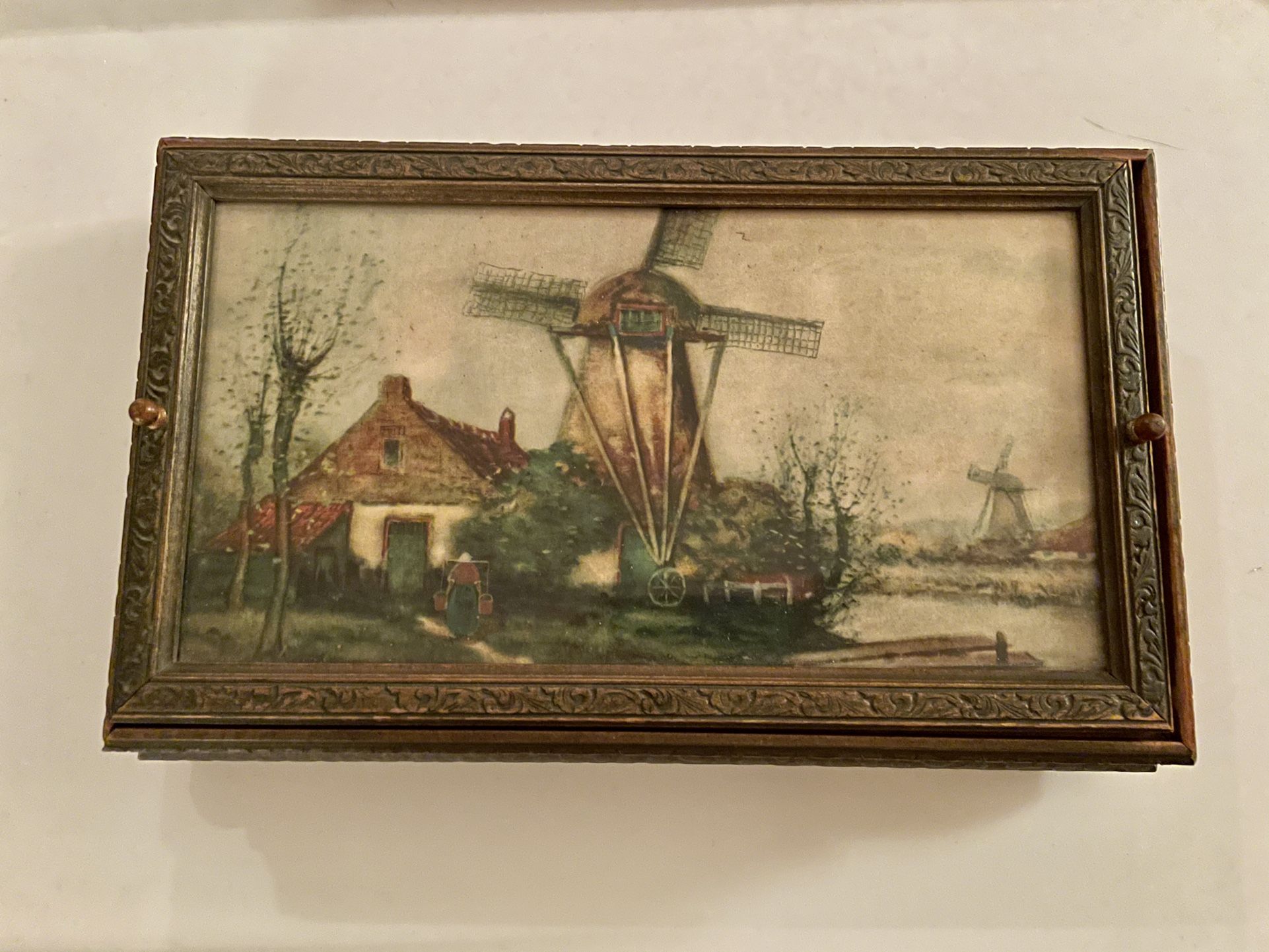 Vintage trinket box in good condition! Beautiful windmill accent with gold details on the sides. About 12” long
