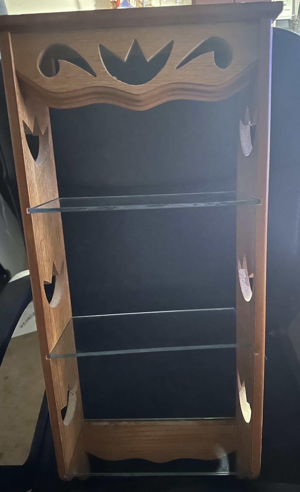 Wooden wall-mounted curio display shelf with tulip cutouts and glass shelves. Common 1980s-1990s home decor.