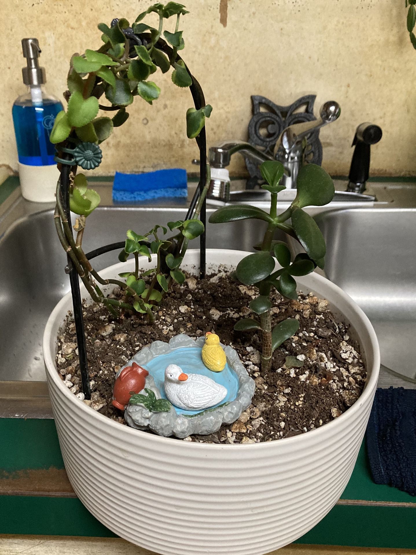 Jade plant with trailing jade on trellis. I have to admit this one was fun to train the trailing jade onto the trellis . Nice ceramic pot. North Portland location.