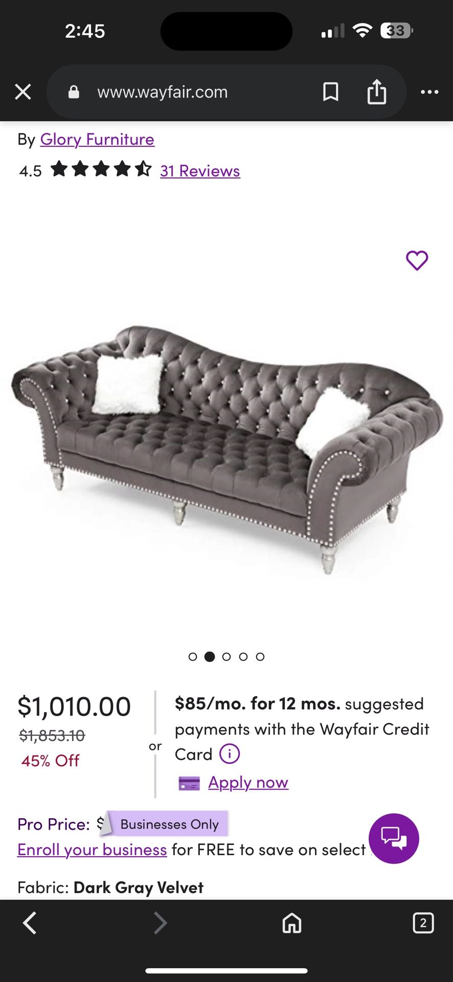 Lyons 89” velvet sofa