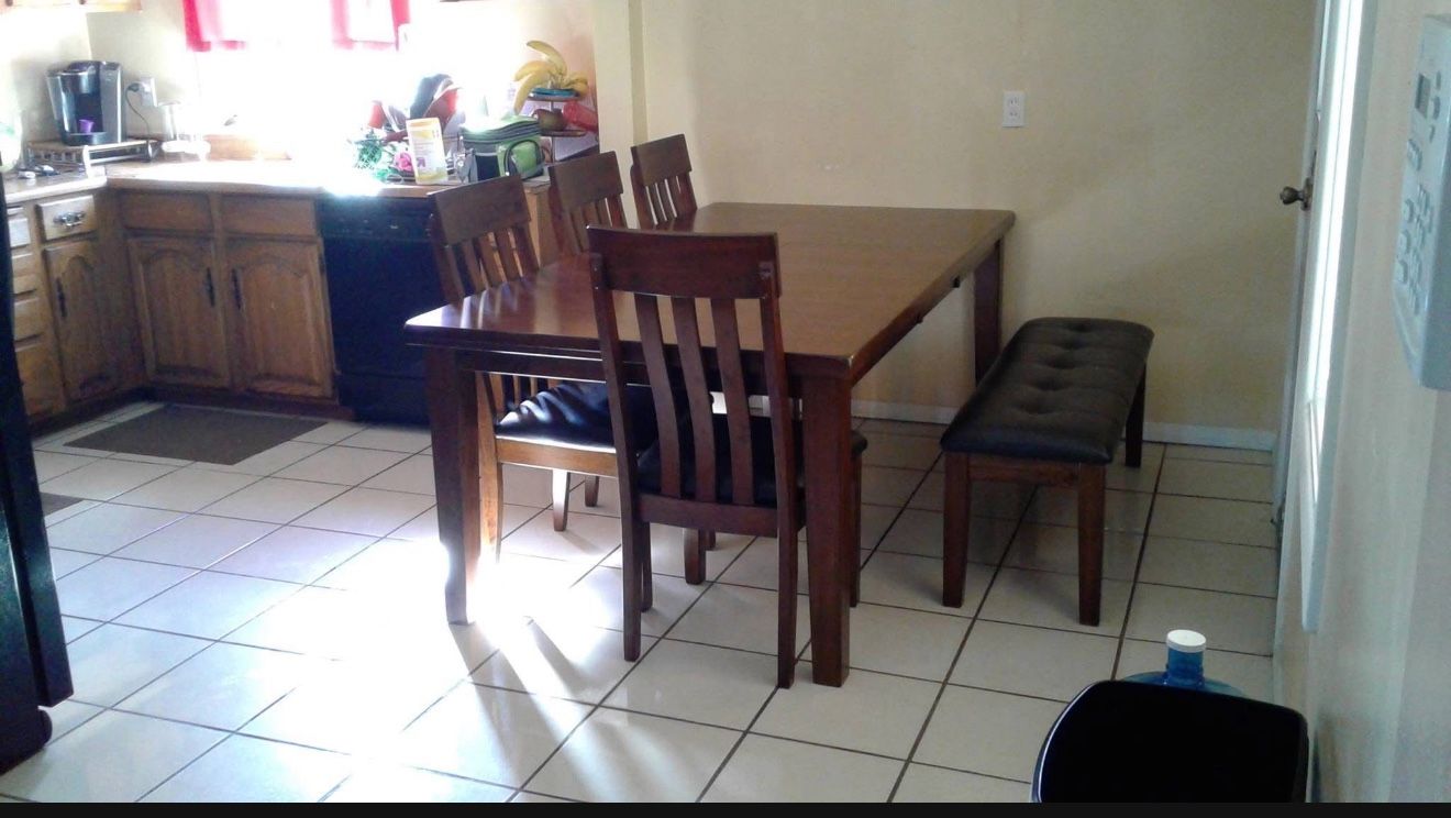 42" W x 60"/78" D x 30" H Table is solid wood has minor scratches! Has an internal extension but its loose needs to be retightened!