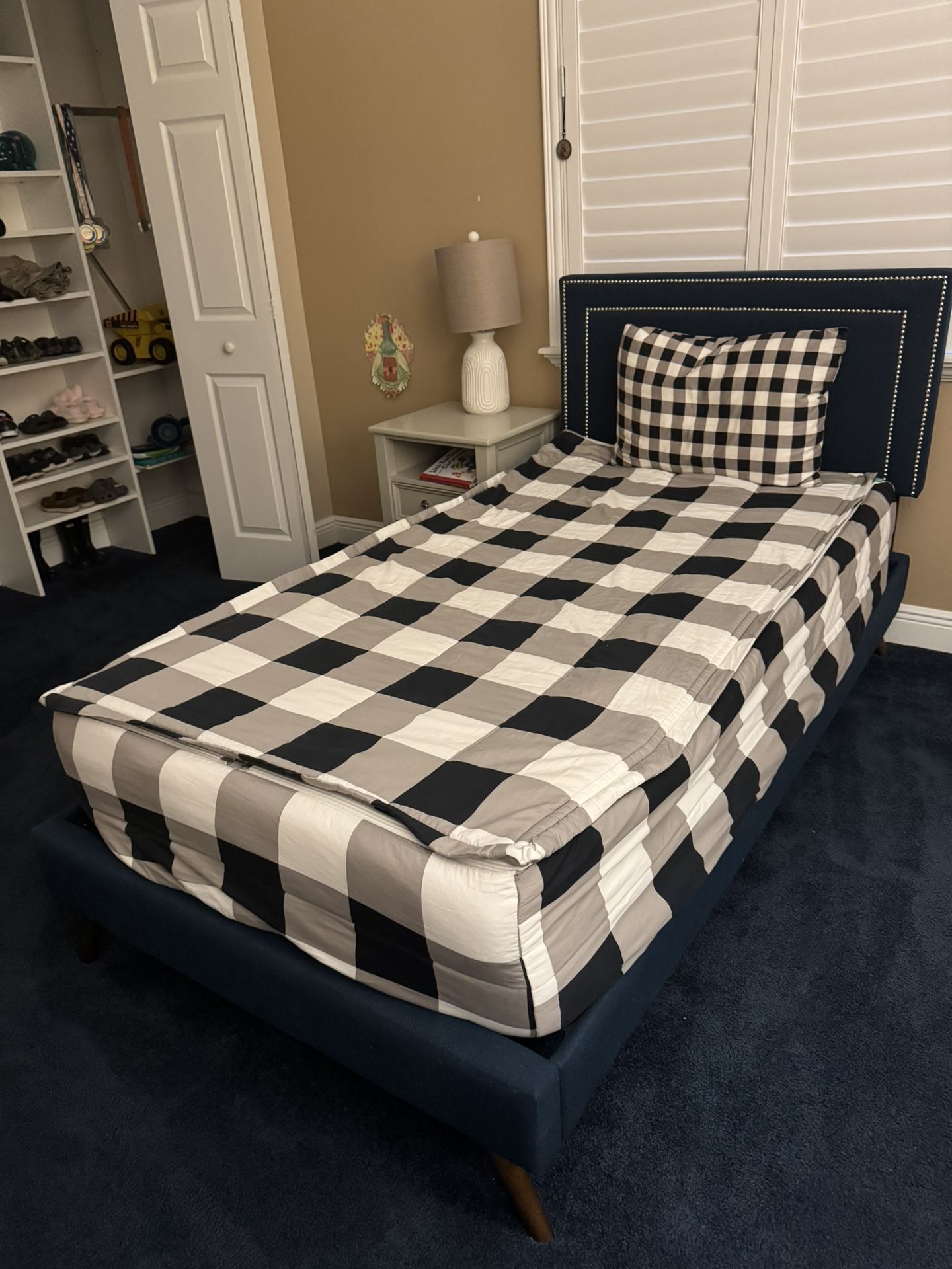 Twin bed with blue upholstered headboard. Frame and headboard connected, headboard is 42 inches high. Simple Wood legs. Perfect for a boys room. Also selling mattress and nightstand if interested.