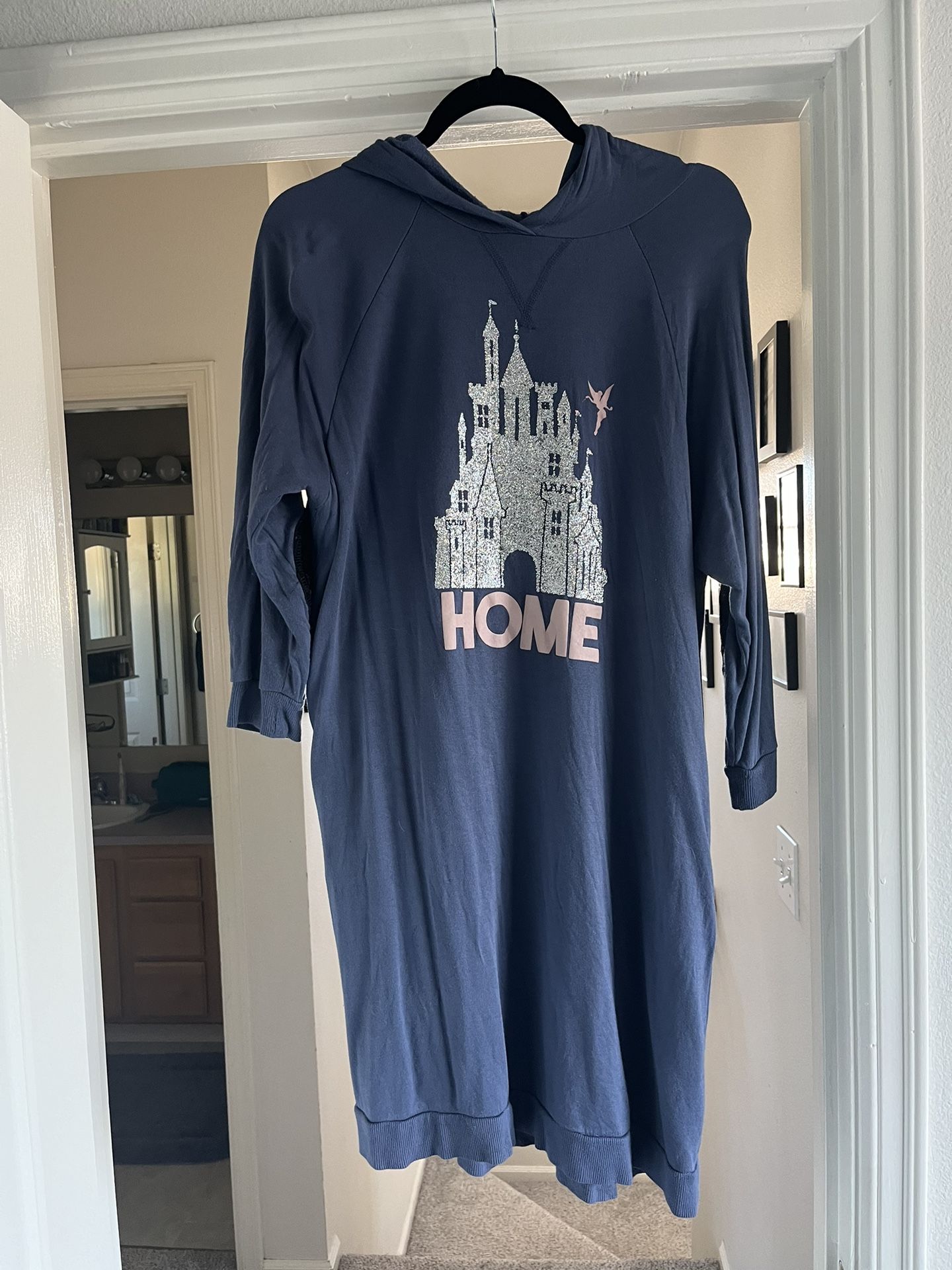 Disney Parks glitter hoodie with embellished elbow patches. Very long, fits more like a shirt dress. Only worn once, smoke free home. Women’s size L, runs large.