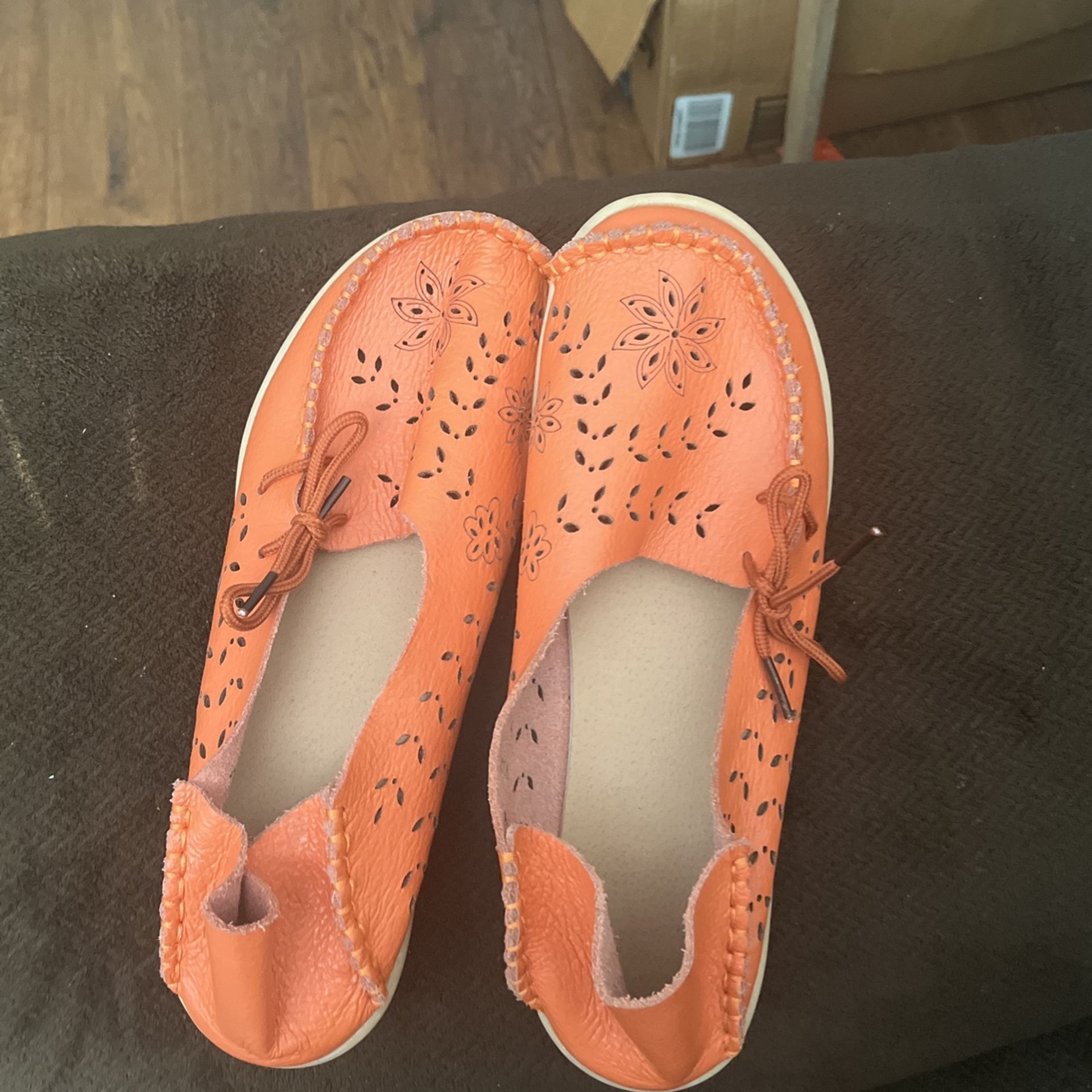 They are made out of soft leather . They are flat and are slip ons . Haven’t been worn .