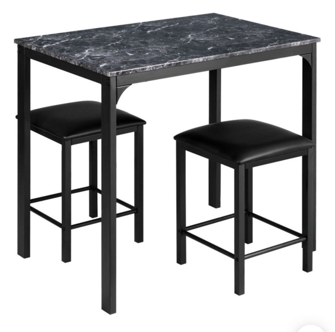 3 Piece Counter Height Dining Set Faux Marble Table 2 Chairs Kitchen Bar Black