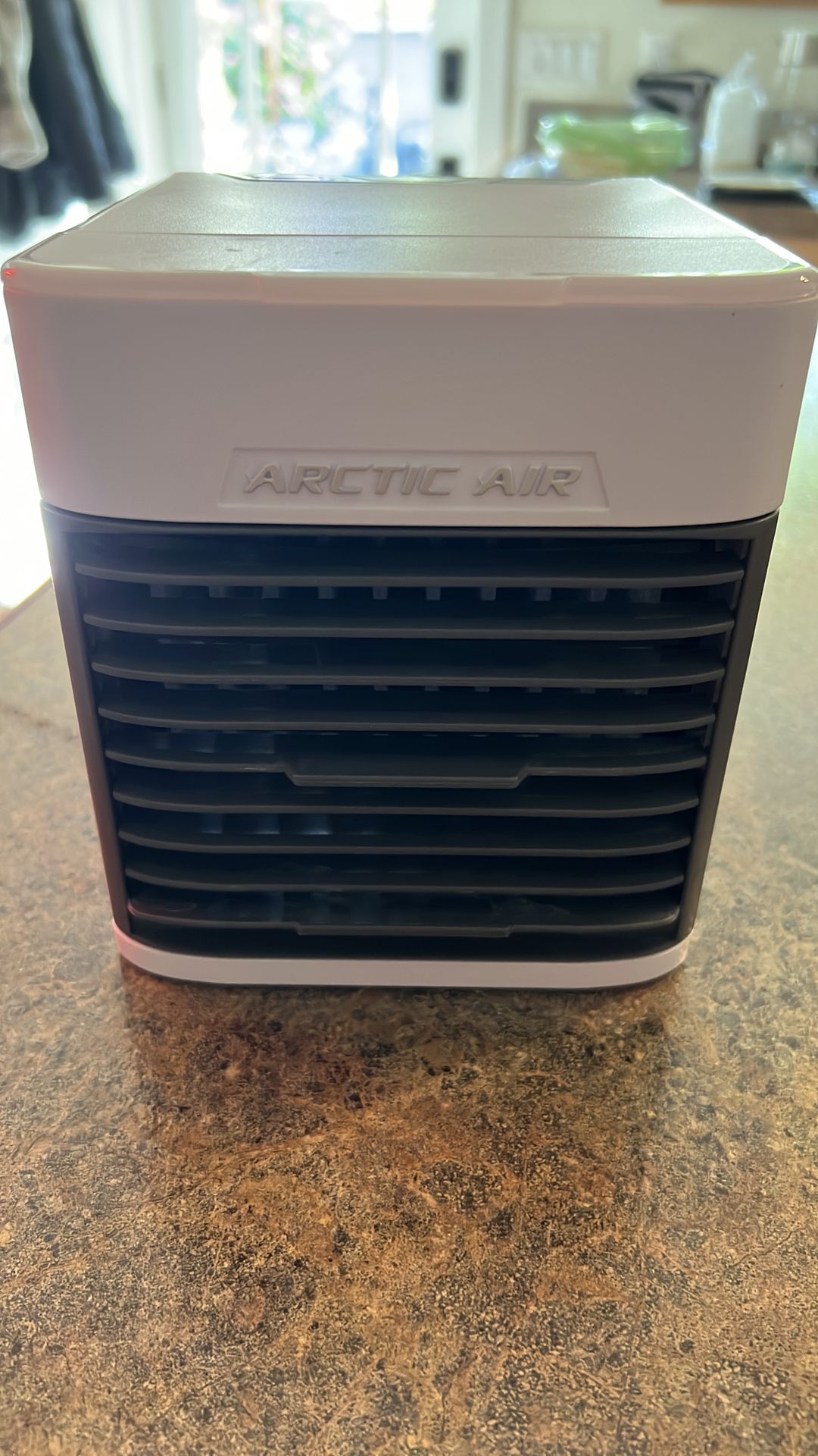 Personal sized plugin fan. Comes with insert that you dampen and can freeze as well as compartment you fill with water so the air is extra chilly and hydrating. The lighting can be controlled as well as fan level has 3 levels. Functions well, no issues. 6.5”x 5.75”