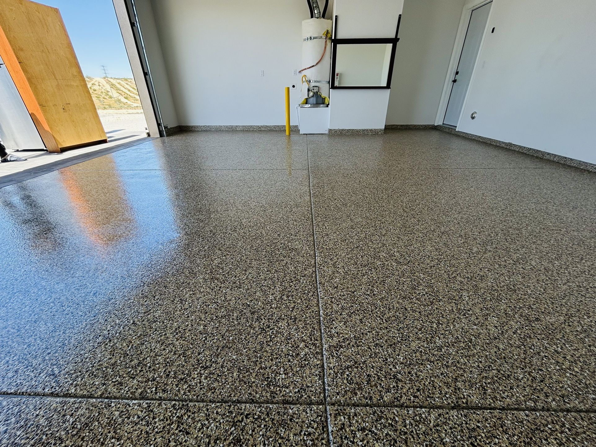 Free Estimates! 3 part high quality epoxy flake system includes 1-Epoxy base coat 2-layer of heavy duty chips 3-Clear coat of Poly aspartic -Easy to clean -Hygienic -Waterproof -Chemical,Heat,Shock,& Oil -25 Colors Available