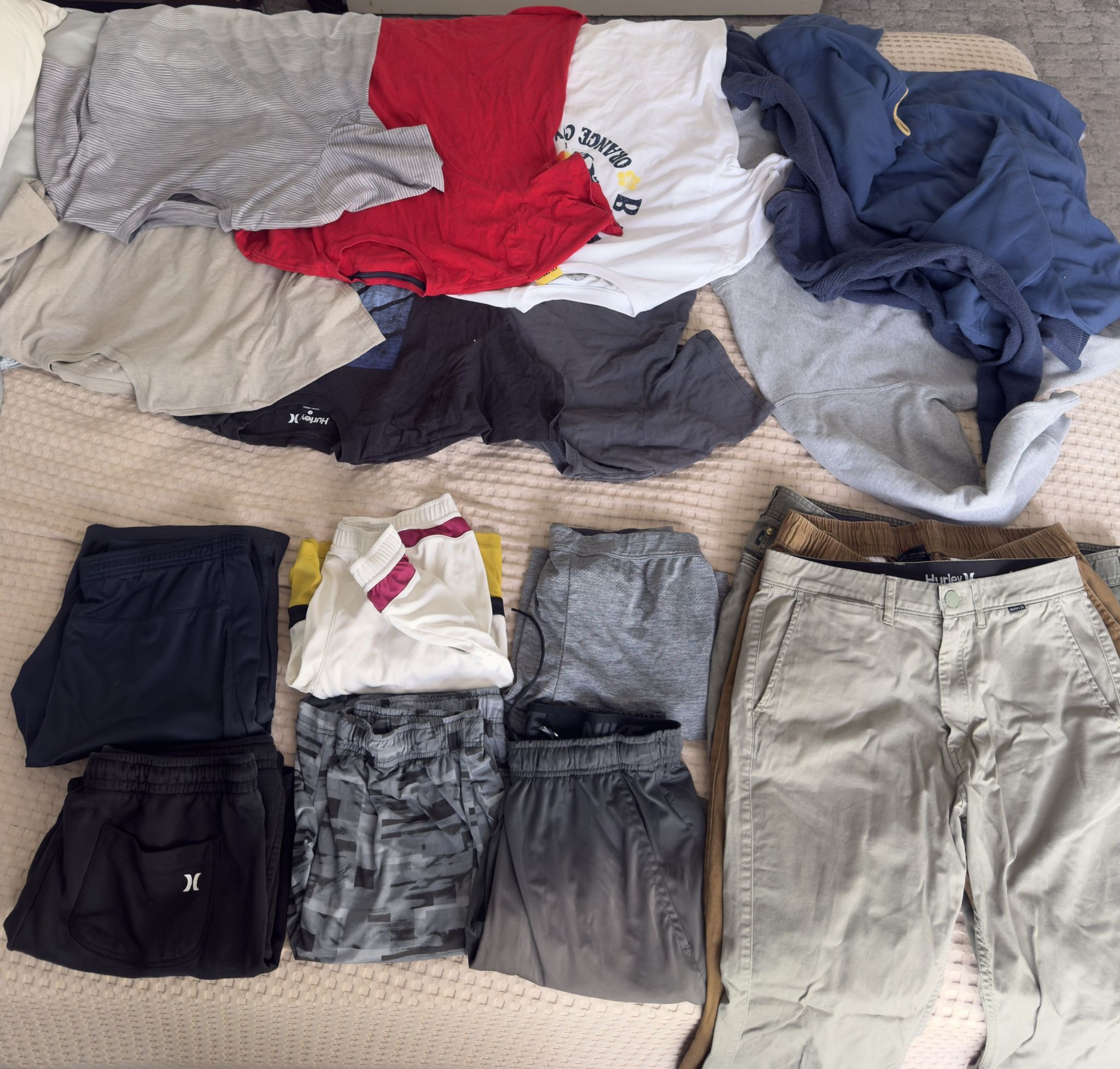 Lot of used men’s clothing items all in size L or XL. A few medium sizes as well. Brands include Nike, Uniqlo, Hurley, Tommy Hilfiger, and Banana Republic. Some items have never been worn before. Excellent conditions! Included with purchase: - 6x Shirts - 6x Shorts - 3x Pullover Jackets - 3x Pants/ Khakis